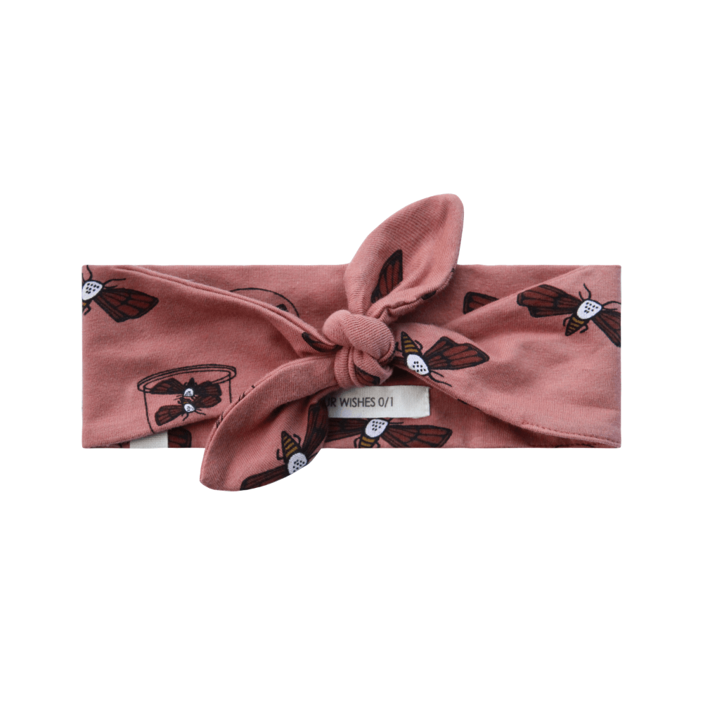 Haarbandje met nachtvlinder printje. Het haarbandje kan in omvang wat versteld worden door de knoop strakker of losser te strikken.