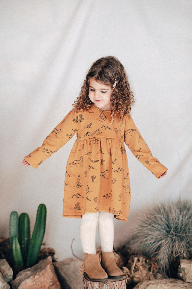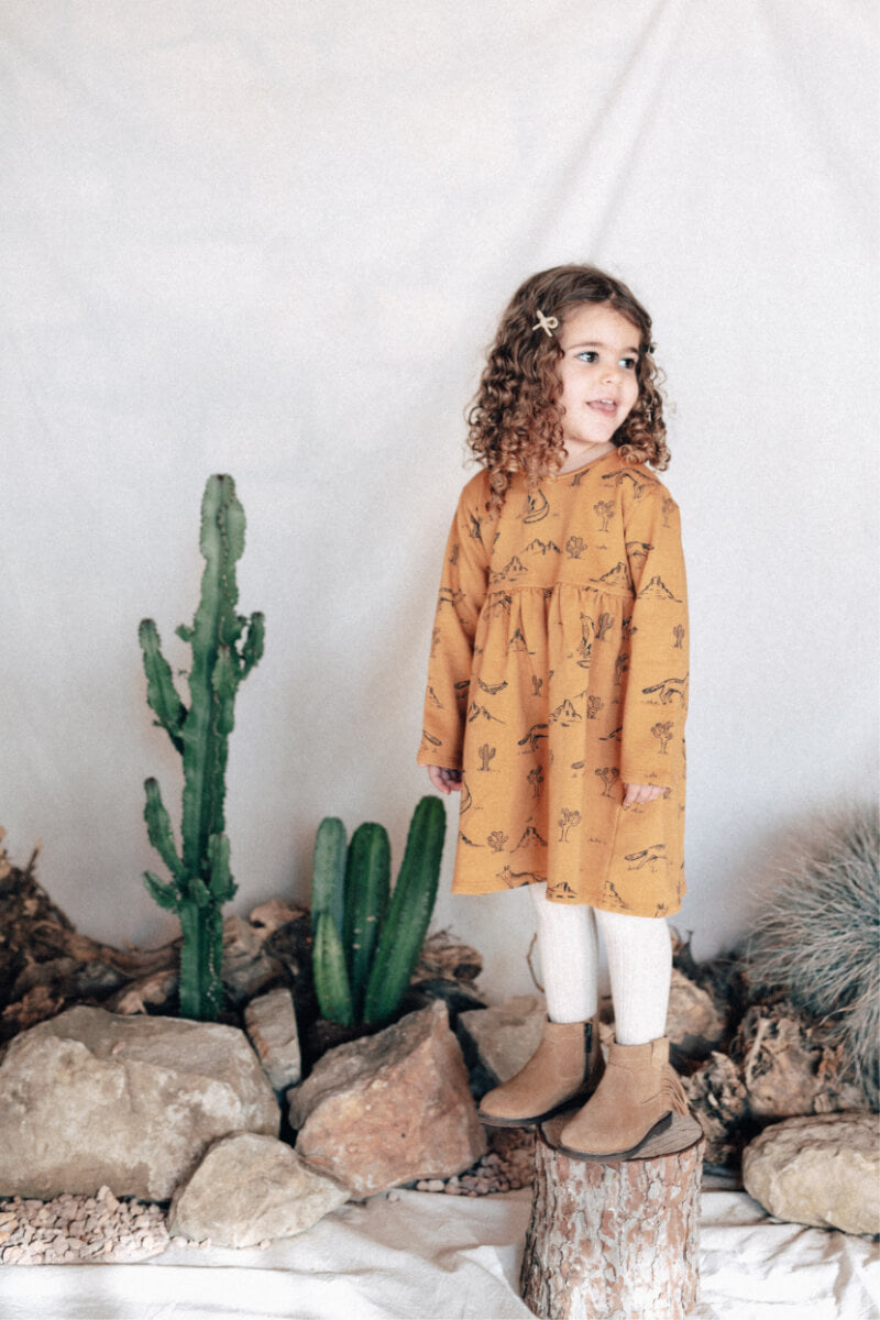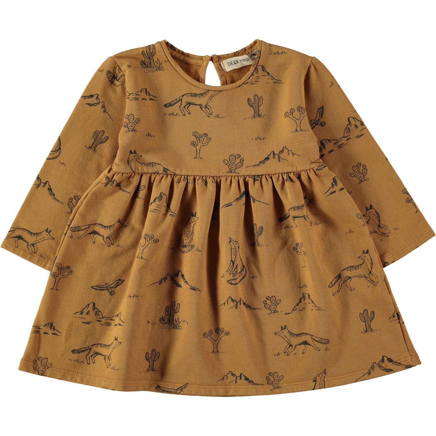 Jurkje van heerlijk zacht katoen met fluffy voering. Het jurkje heeft op de borst een nauwsluitende fit en valt aan de onderkant wijd uitlopend met plooien, heeft achterop de nek een knoopsluiting en een stoere all-over woestijnprint.