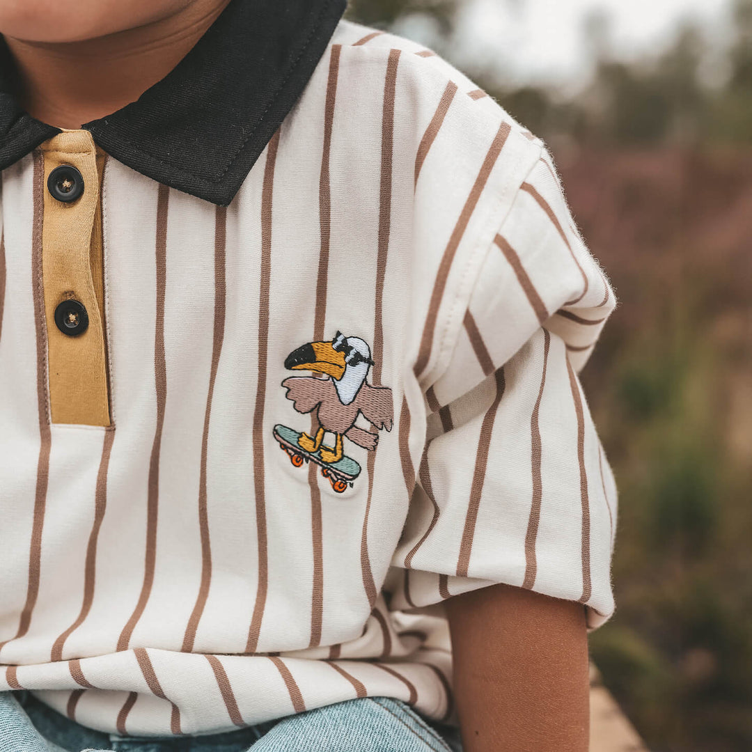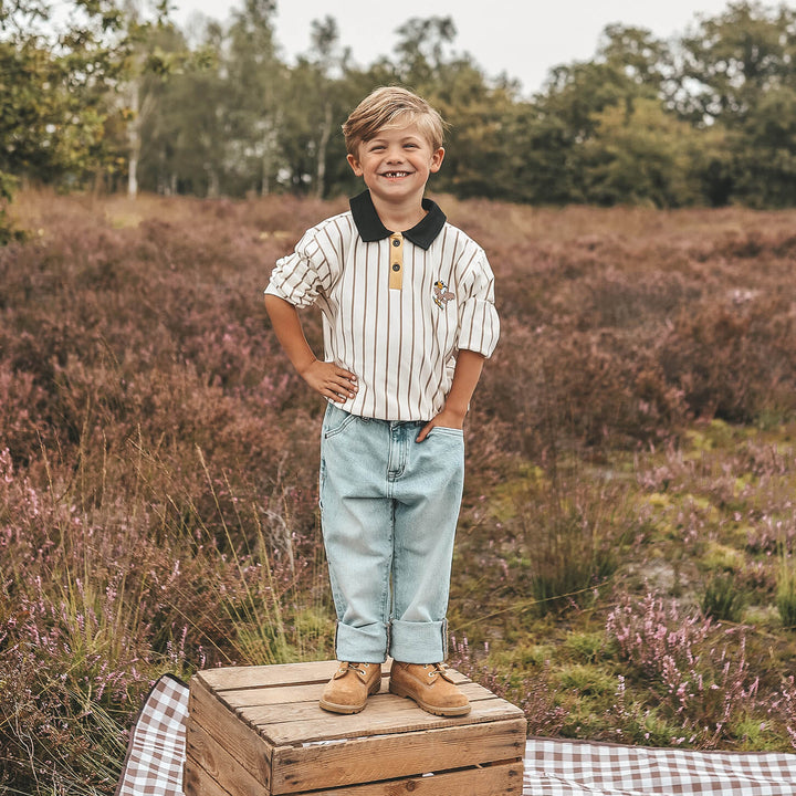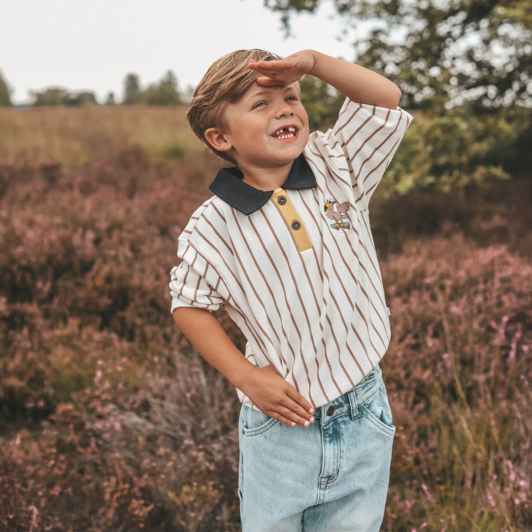 Met deze stoere polo sweater van Your Wishes zal uw kindje zich zeker cool voelen! De sweater is gemaakt van heerlijk zacht katoen. De trui heeft een mooie creme kleur met een fijne beige streepje. De uiteinde van de mouwen en de onderzijde zijn afgewerkt met een elastische band. Het kraagje is zwart van kleur met knoopjes aan de voorzijde en op de borst is een grappige vogel op een skateboard geborduurd.