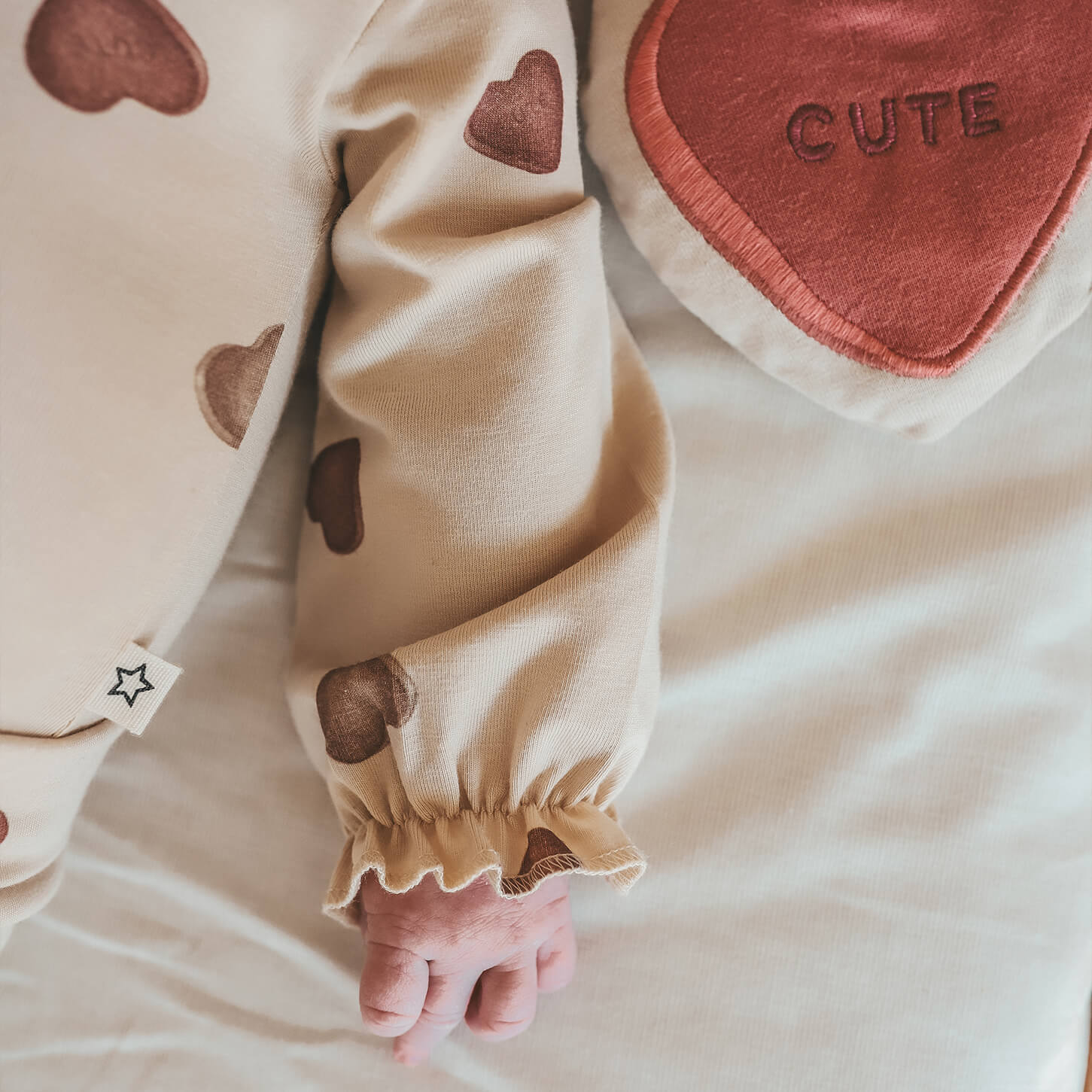 Dit superlieve newborn rompertje van Your Wishes is toch te schattig om niet in de garderobe van uw kleine meid te hebben? Het rompertje heeft een ecru kleurige achtergrond met een all-over printje van roze snoephartjes. Het ruffle kraagje en ruffles met elastiek aan de uiteinde van de mouwtjes geven de romper een lieve en schattige uitstraling. Het rompertje is verkrijgbaar in de maten 50 t/m 74 en is gemaakt van een mix van katoen, modal en elastaan wat het super zacht, stretchend en comfortabel maakt voor de gevoelige babyhuid. Wilt u de outfit compleet maken? Match de romper dan met de Solid Legging Withered Rose, de Quilted Jersey Cardigan en de Lace Socks.