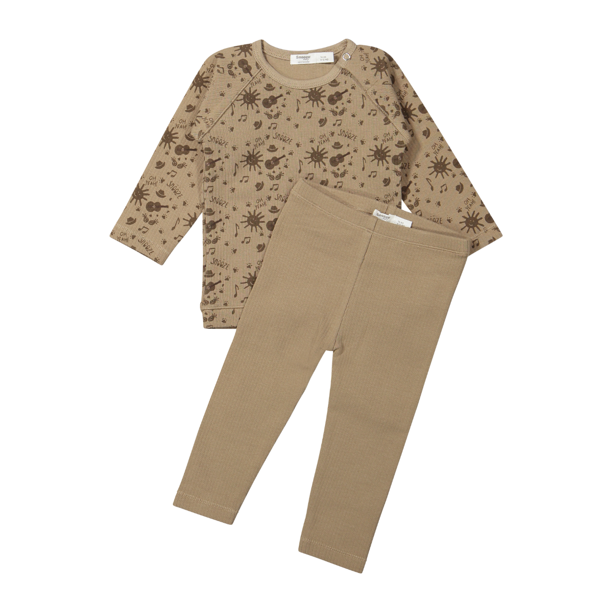Na een lange ochtend of middag spelen en ontdekken is een middagdutje of nachtrust belangrijk voor de ontwikkeling voor uw baby! En wat is er dan beter dan het comfortabel maken van uw kindje door een heerlijke zachte pyjama aan te trekken. De pyjama's van Snoozebaby zijn perfect voor elke slaap of dit nou een middagdutje is of een hele nacht slapen. Deze leuke pyjama van Snoozebaby is gemaakt van heerlijk zacht 100% organisch katoen en heeft een fijne rib. De pyjama heeft een lange broek en lange mouwen waardoor die perfect is voor koudere dagen en in de ronde hals zit een drukknoop om het aan- en uitkleden gemakkelijk te maken. Verder heeft de pyjama een hazel bruine kleur met een speels printje van onder andere gitaren, muzieknootjes en vrolijke zonnetjes.
