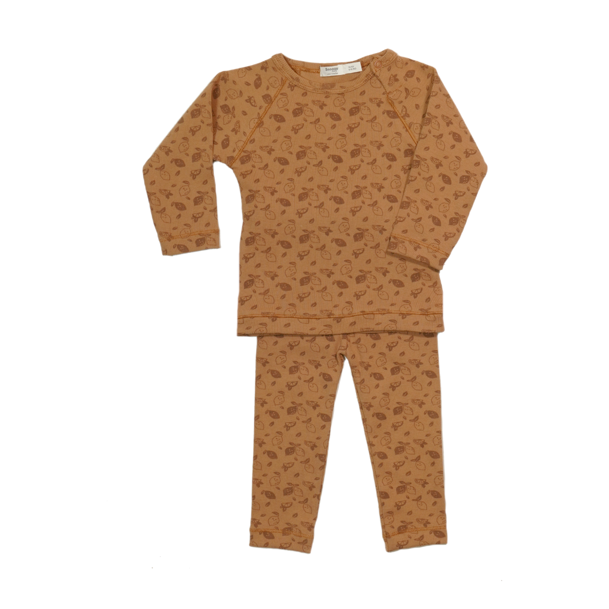 Met deze superleuke pyjama van het merk Snoozebaby wordt slapen iets om naar uit te kijken. De pyjama is namelijk superzacht en comfortabel zodat uw kleintje met gemak toekomt aan een goede nacht rust. Gemaakt van 100% organisch katoen met een fijne rib structuur. De lange mouwen en lange broek houden uw kindje warm tijdens koude dagen terwijl de ronde hals met drukknoop er voor zorgen dat aan- en uitkleden een eitje wordt. De toffe bruine kleur met vrolijke citroenen print geven de pyjama een speelse uitstraling.