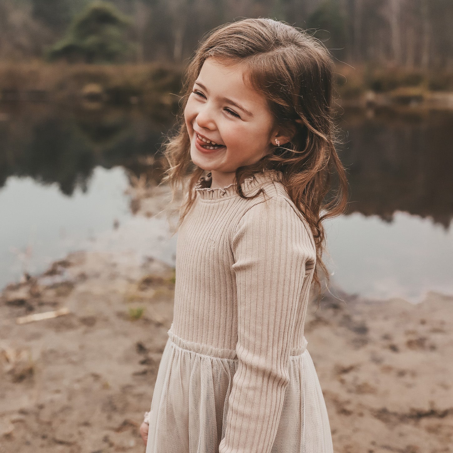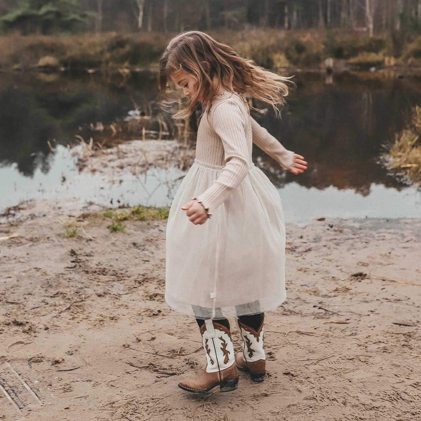 Met deze prachtige jurk van Your Wishes steelt uw kleine meid zeker weten de show! De jurk heeft een mooie lichtbeige kleur en heeft een fijn gebreide top met lange mouwen en ruffle randje in de hals en aan het uiteinde van de mouwen. De rok van de jurk bestaat uit meerdere laagjes van zachte tule in dezelfde kleur als de top. De onderrok in dezelfde kleur zorgt ervoor dat de jurk niet door schijnt. De jurk heeft een recht model en valt tot iets onder de knie. Voor een feestje of een speciale gelegenheid is deze jurk een ware eyecatcher, echter kan de jurk ook casual gedragen worden. Door de fijne gebreide top is de jurk ook heel erg comfortabel. Verkrijgbaar in de maten 80 t/m 140.