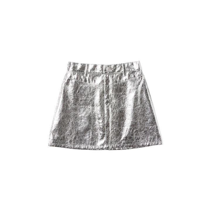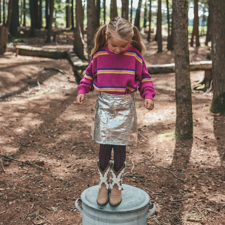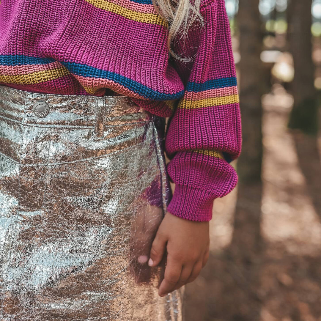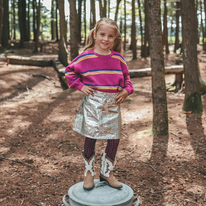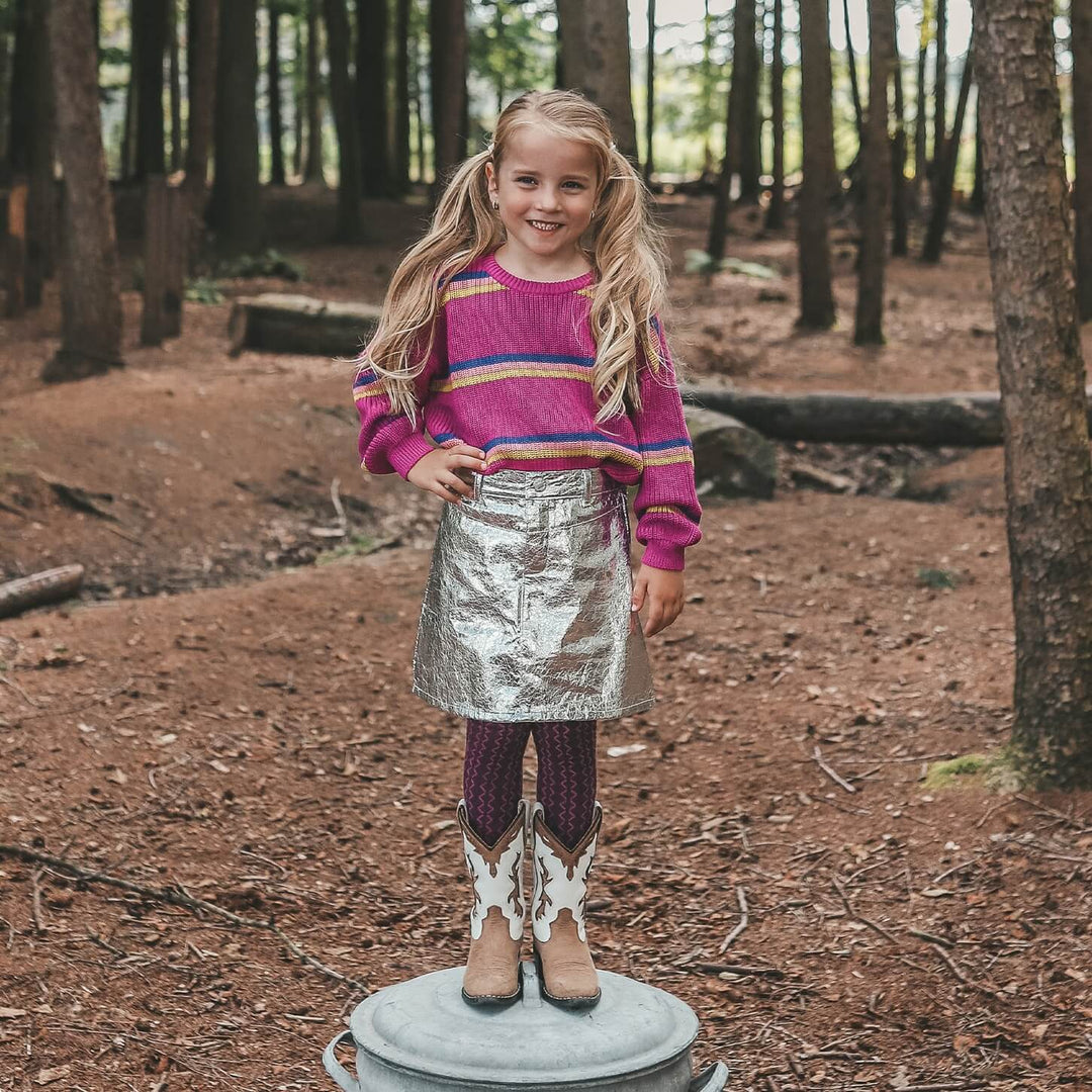 Laten we naar de ruimte gaan! De Space mini skirt is niet alleen trendy, maar ook veelzijdig! Deze rok is verkrijgbaar in maat 98 tot en met 140. De metallic zilveren finish voegt een speels element toe aan elke outfit, of het nu voor een feestje is of gewoon een leuke dag uit. Het gebruik van 100% polyester zorgt ervoor dat de rok comfortabel en lichtgewicht is, wat perfect is voor uw kleine meid. Voor een complete look kunt u de rok combineren met onze Rolo Collar Blouse die elegantie toevoegt aan de speelse stijl van de rok of de Stripe Knit Chunky Sweater voor een meer casual look. Shop nu en uw kindje zal schitteren in de Space Mini skirt!