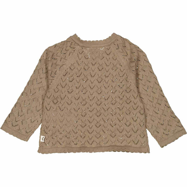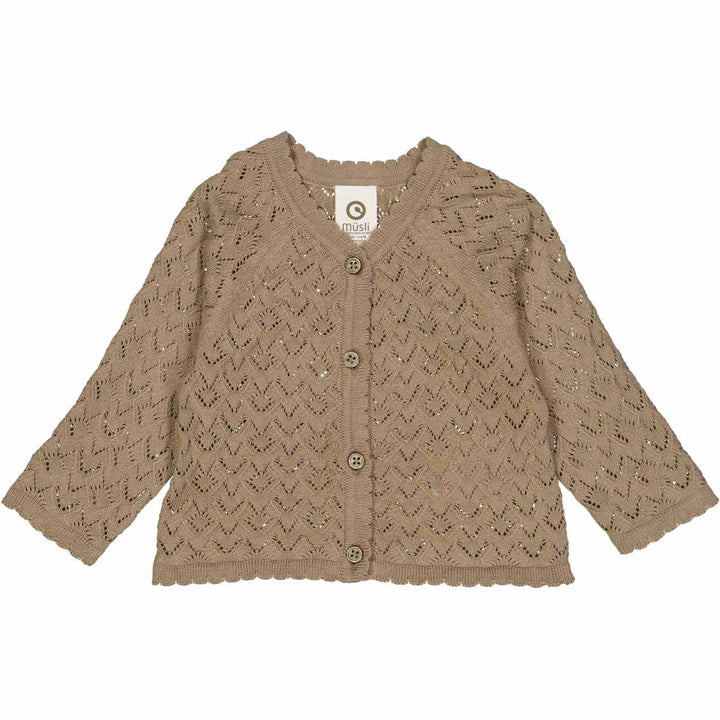 Super leuk en mooi gebreid vestje met leuk gaatjespatroon in het breisel. Het vest sluit met knoopjes aan de voorkant. De knopen zijn gemaakt van corozonoot, 100% katoen, gebreid met patroon.