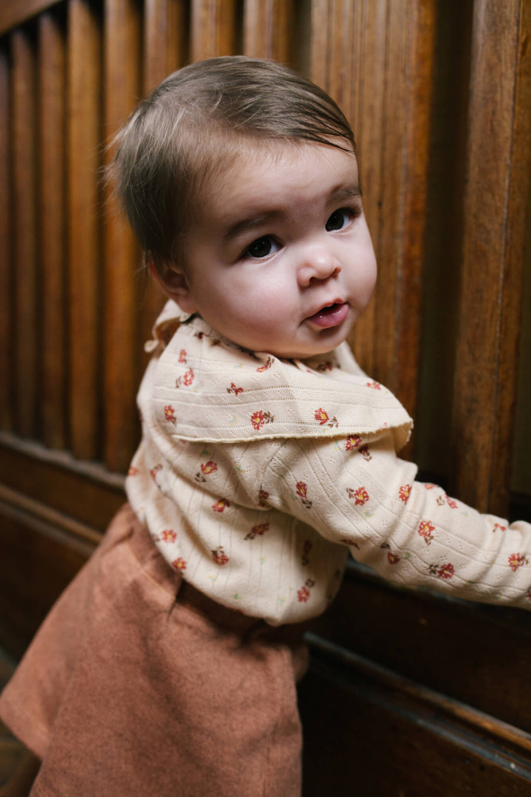 Super schattige longsleeve shirt voor de allerkleinsten. Dit lieve ecru kleurige shirtje heeft lange mouwen, een grote ruffle kraag en een knoopje achterin de nek om het aan het uittrekken gemakkelijker te maken. Verder heeft het een mooi all-over fijne bloemetjes print en is het gemaakt van heerlijk zacht en warm biologisch katoen om uw kleintje heerlijk warm en comfortabel te houden tijdens koude dagen.