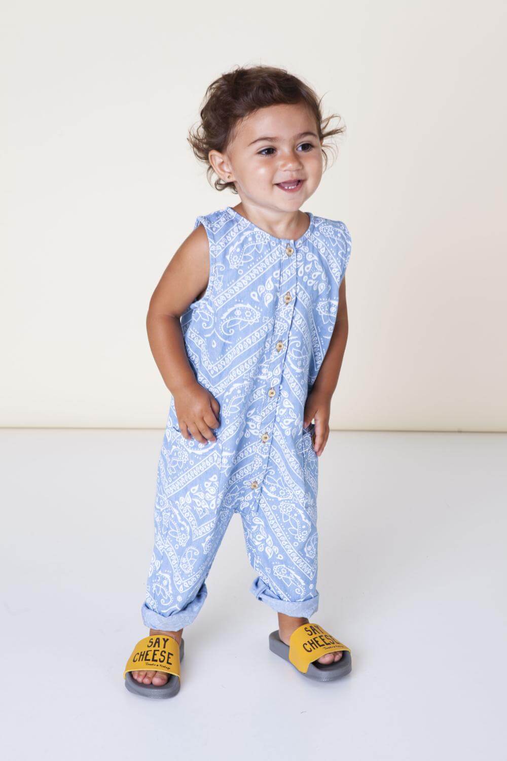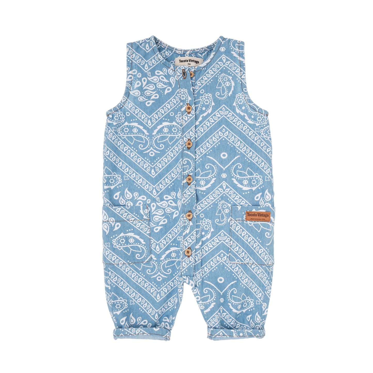 Stoere jumpsuit van zacht en luchtig katoen. De jumpsuit heeft een loose fit, is mouwloos heeft een lichtblauwe denim kleir met een all-over bandana print, knoopjes aan de voorkant en twee steekzakken