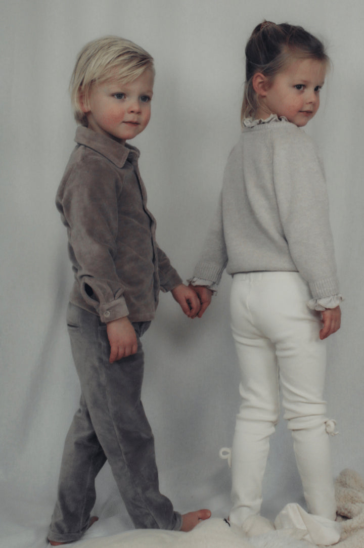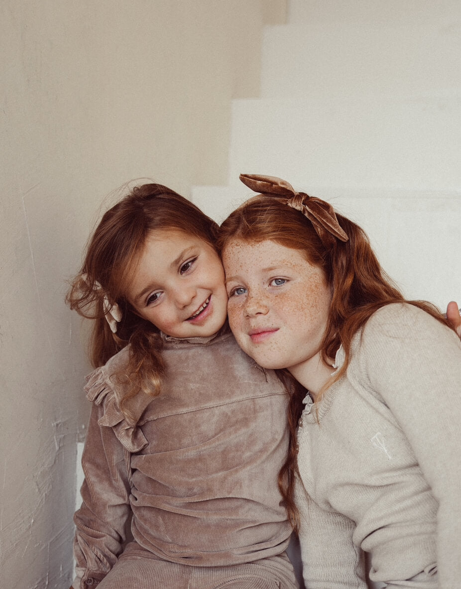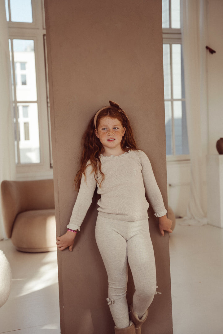Heerlijk zachte en warm gebreide sweater met een sierlijke twist speciaal voor de meisjes. De beige kleurige sweater is van 100% biologisch katoen met elastische randen aan de onderzijde en de uiteinde van de mouwen. Zowel bij de kraag als bij de uiteinde van de mouwen zitten mooie rushes van zachte jersey katoen. In de hals zijn nog extra knoopjes om het aan- en uitkleden gemakkelijker te maken.