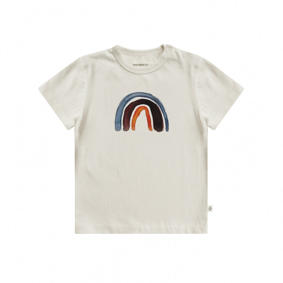 Newborn shirtje van het merk Your Wishes. Dit lieve ecru kleurige shirtje is gemaakt van heerlijk zacht en stretchend katoen, heeft korte mouwen en een mooie regenboog opdruk. Het shirtje is unisex dus mooi voor meisjes en jongens.