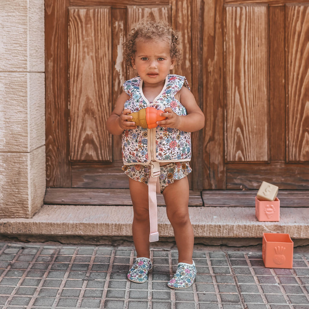 Zorgeloos uw kindje laten spelen bij het zwembad of aan het strand ook wanneer het een kiezelstrand is of wanneer er veel schelpjes zijn? Deze prachtige waterschoentjes bieden die optie! Deze mooie waterschoentjes zijn gemaakt van 77% polyester, 19% lurex en 4% elastaan en hebben een stevige zool met grip. De stevige zool bieden de voetjes van uw kindje bescherming tegen steentjes en scherpe schelpjes en tegelijkertijd bieden ze ook genoeg grip op de vloer zodat uw kindje minder snel uitglijd. De bovenzijde van het schoentje bied een perfecte mix van stevigheid en elasticiteit voor een perfecte pasvorm maar ook om het aan en uittrekken van het schoentje gemakkelijk gaat. Verder hebben deze schoentjes een romantische all-over bloemenprintje met glitter en zijn ze verkrijgbaar in de maten 18/19 t/m 30/31. Ook zo'n fan van dit mooie printje? Stijl deze mooie schoentjes dan met de Sparkly Fleurs Swimsuit en de Sparkly Fleurs Floating Vest om de look af te maken.