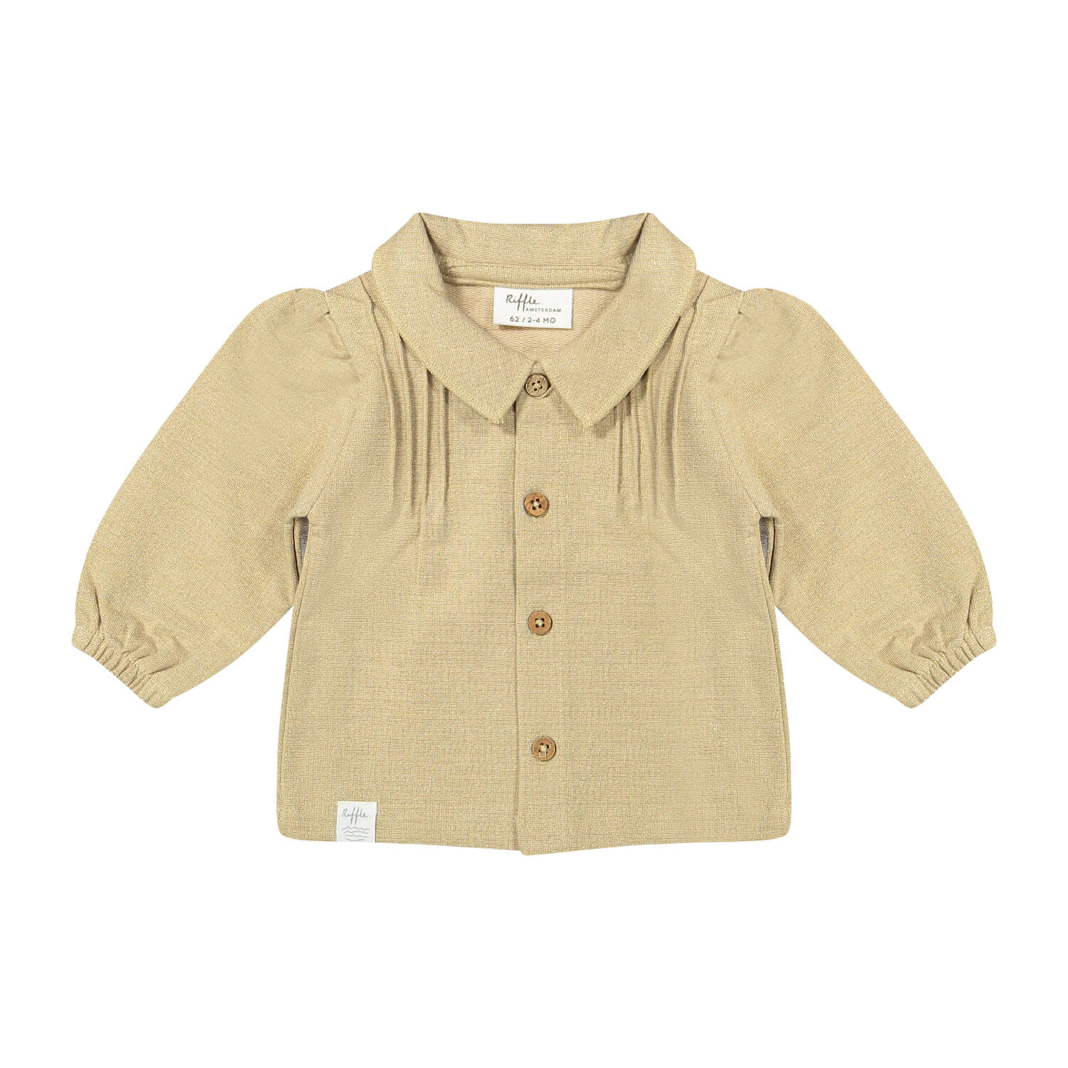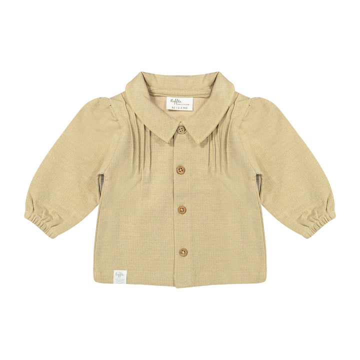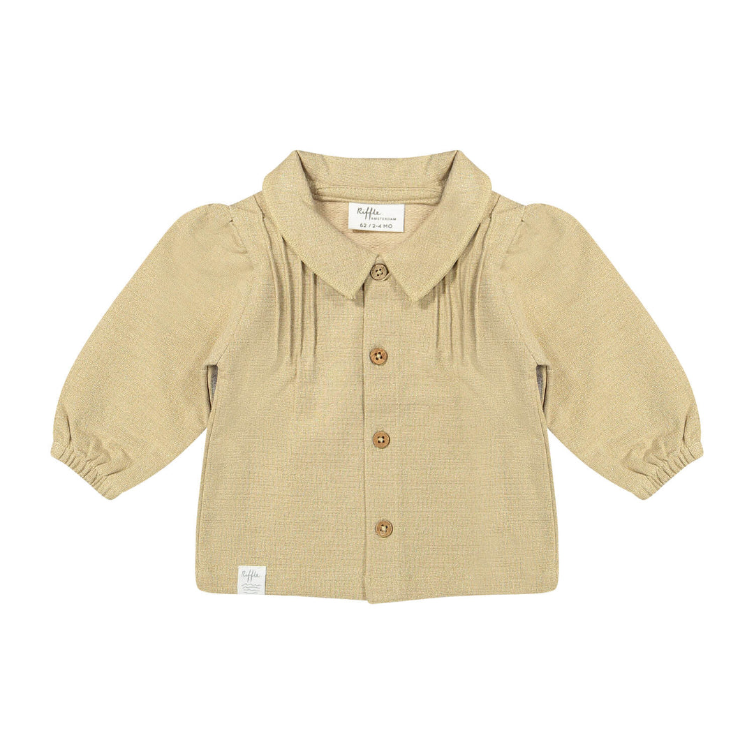Mooie blouse voor meisjes van 100% biologisch katoen. De blouse heeft lange pofmouwen met elastiek aan de de uiteinde van de mouwen en knoopjes aan de voorzijde. De gouden glitter kleur en sierlijke kraag geven dit blousje een chique look wat het niet alleen mooi maakt om casual te dragen maar ook perfect is voor een speciale gelegenheid of een feestdag. Een echte musthave in de garderobe van uw kleine meid!