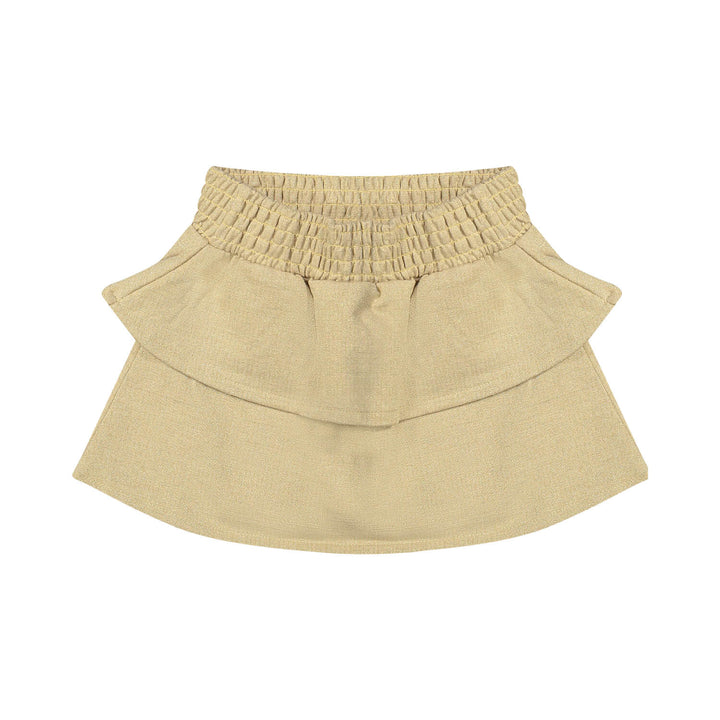 Mooie sierlijke rok van 100% biologisch katoen. De rok heeft een wijd uitlopend model tot net boven de knie en heeft meerdere laagjes voor dimensie. Verder heeft de rok een elastische tailleband voor de perfecte pasvorm. De gouden glitterkleur geeft de rok een chique uitstraling waardoor die niet alleen casual gedragen kan worden maar ook perfect is voor speciale gelegenheden of feestdagen.