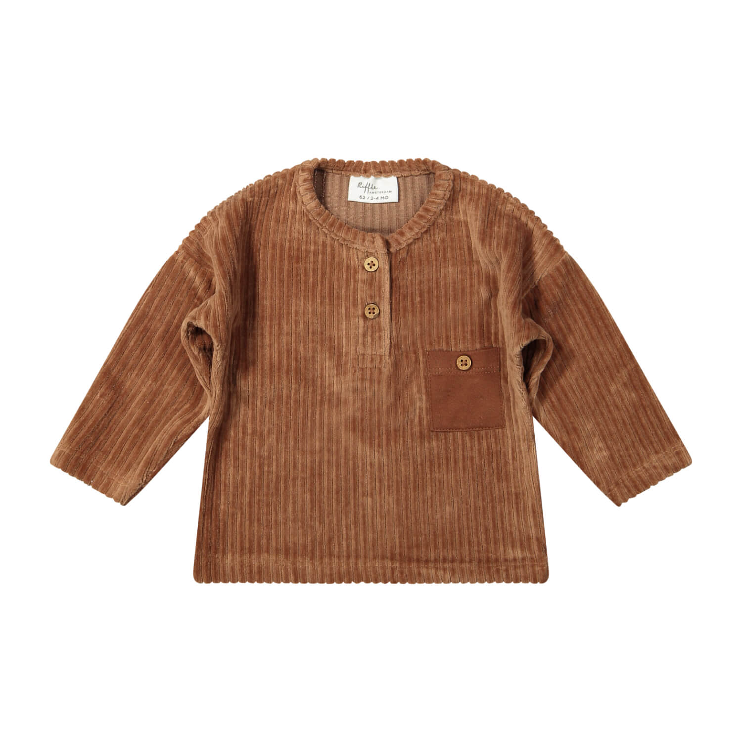 Longsleeve t-shirt voor jongens en meisjes van lekker warm biologisch katoen in zachte corduroy kwaliteit. Het t-shirt heeft lange mouwen, een borstzakje met knoopje en knoopjes aan de voorzijde om het aankleden gemakkelijker te maken. De mooie bruine kleur matched super mooi bij de andere items uit de Play in the City collectie van Riffle.
