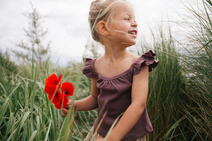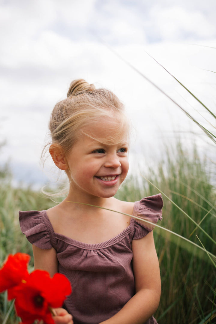 Dit mooie basic topje van Riffle is een prachtige aanwinst voor elke outfit van meisjes. Gemaakt van 100% organisch rib katoen en verkrijgbaar in de maten 74 t/m 128. Dit stofje heeft een fijne rib structuur en is zacht en stretchend. Het model heeft een loose fit en spaghetti bandjes met ruffles voor een unieke uitstraling. De mooie paarse kleur zorgt ervoor dat dit topje mooie te combineren is met de andere items uit de Beach Hangout Collectie van Riffle. Stijl dit mooie topje bijvoorbeeld met de Flared Pants Percy Sea Flower of de Short Zed Sunshine.