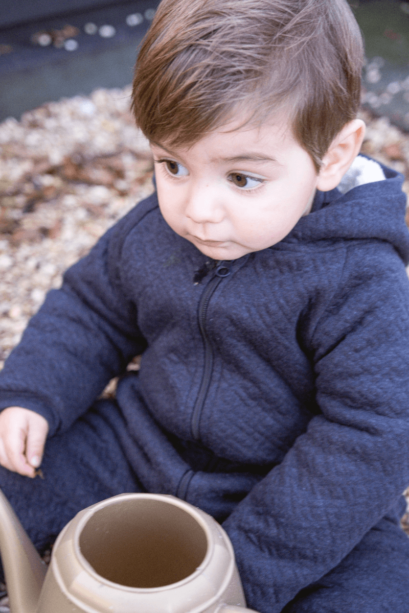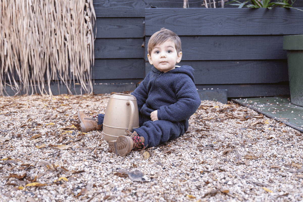 Outdoor suit made of quilted quality and fake fur. Just like the Cardigan, this outdoor suit can be worn on both sides. So both with the quilt side on the outside and vice versa, with the fake fur on the outside. Wonderfully warm for the cold winter days.