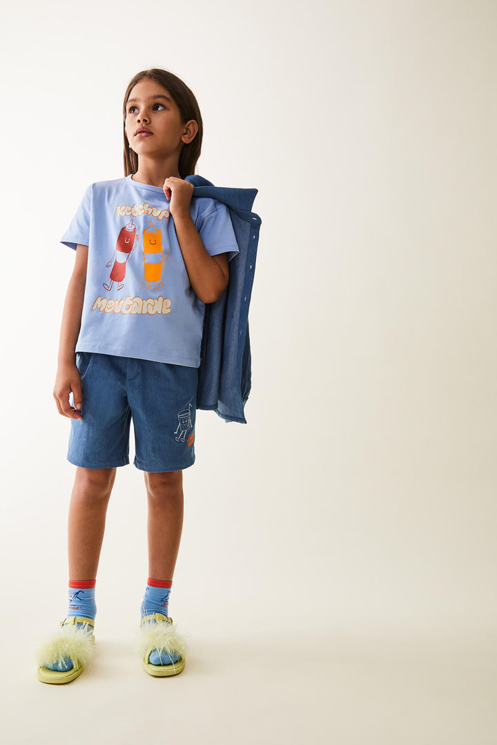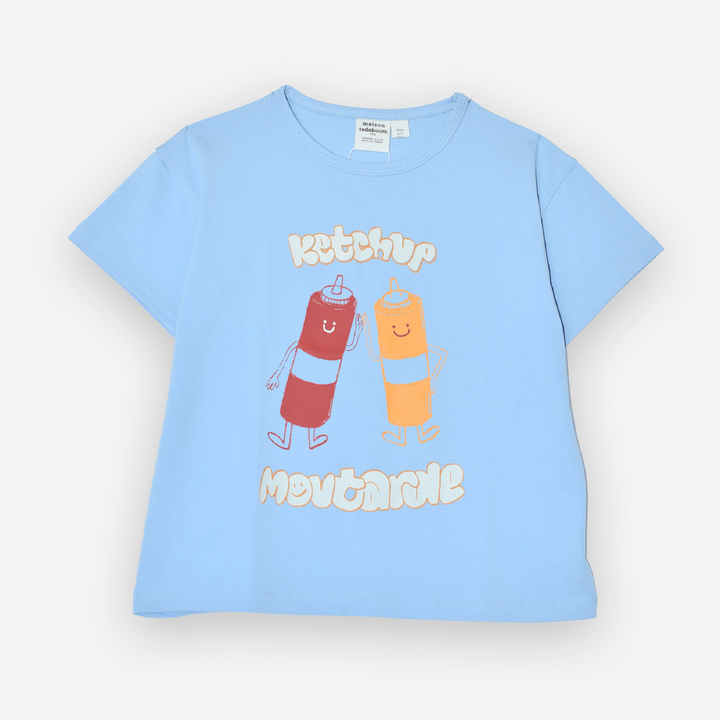 Cheerful unisex shirt made of soft and supple cotton. The shirt has a light blue color, short sleeves and a funny ketchup and mustard print on the front.