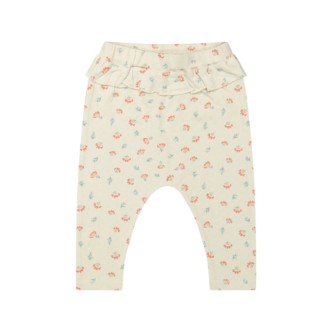 Fijn broekje voor de allerkleinsten. Dit fijne broekje van Riffle is gemaakt van 100% biologisch Pointelle rib katoen. Dit stofje is extra zacht voor de gevoelige babyhuid en heeft van zichzelf al een mooi patroontje. Verkrijgbaar in de maten 50 t/m 68 heeft dit fijne broekje een mooie ecru kleur met subtiel bloemenprintje. Het baggy model geeft extra ruimte voor de luier, waarbij de smallere broekspijpjes weer voor een fijne en comfortabele pasvorm zorgen.  De elastische tailleband maakt het aan en uit trekken gemakkelijk, handig bij het verschonen en het ruffle detail geeft dit broekje een schattige uitstraling. Combineer dit mooie broekje met de Turn Over Top Nova Pointelle en de Hat Bowie Pointelle en ga voor een complete Co-ord look.