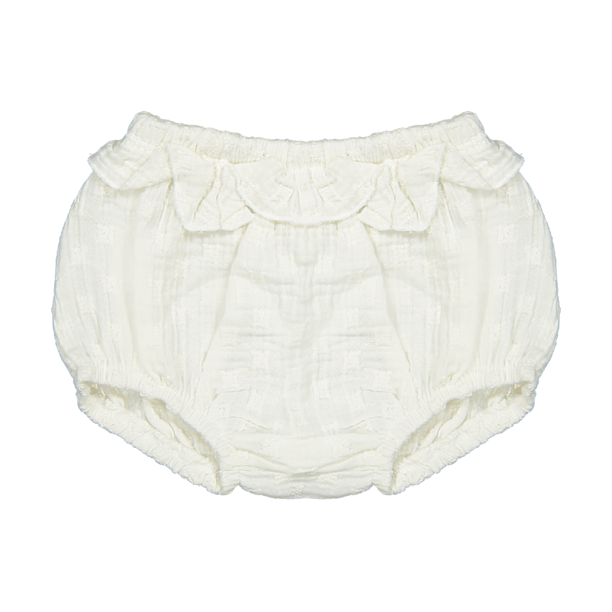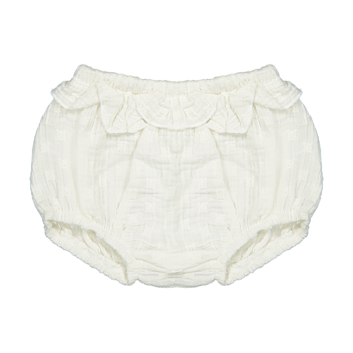 Schattige bloomer voor de kleine meisjes! De bloomer heeft een elastische tailleband met ruffles en elastische openingen voor de beentjes. Gemaakt van heerlijk zacht en luchtig biologisch katoen, perfect voor de warme zomerdagen.