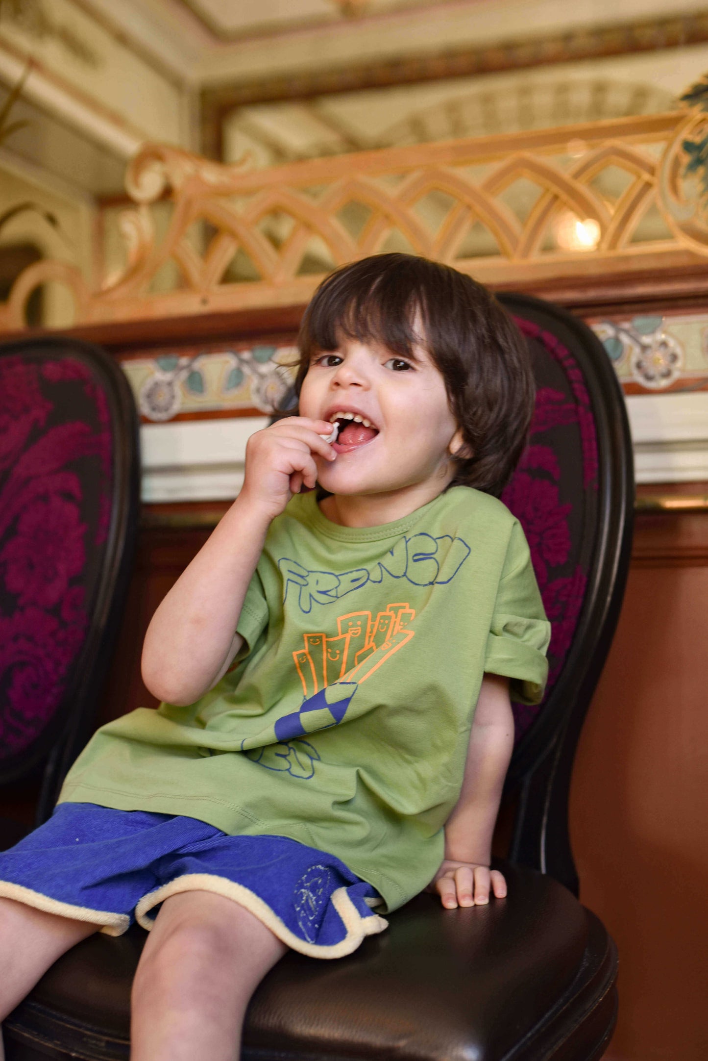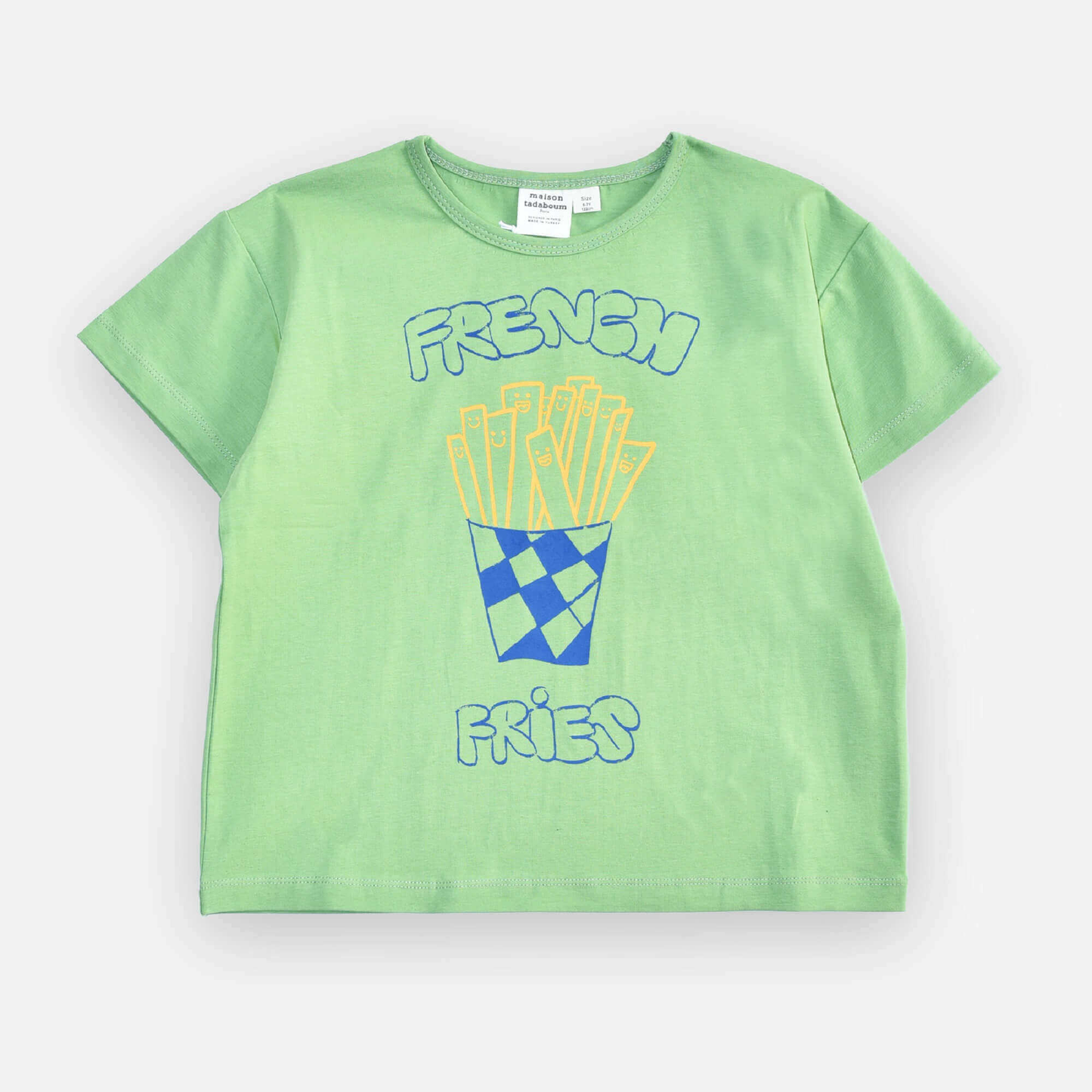 Cheerful unisex shirt made of soft and supple cotton. The shirt has a light green color, short sleeves and a yellow and blue print of French fries on the front.