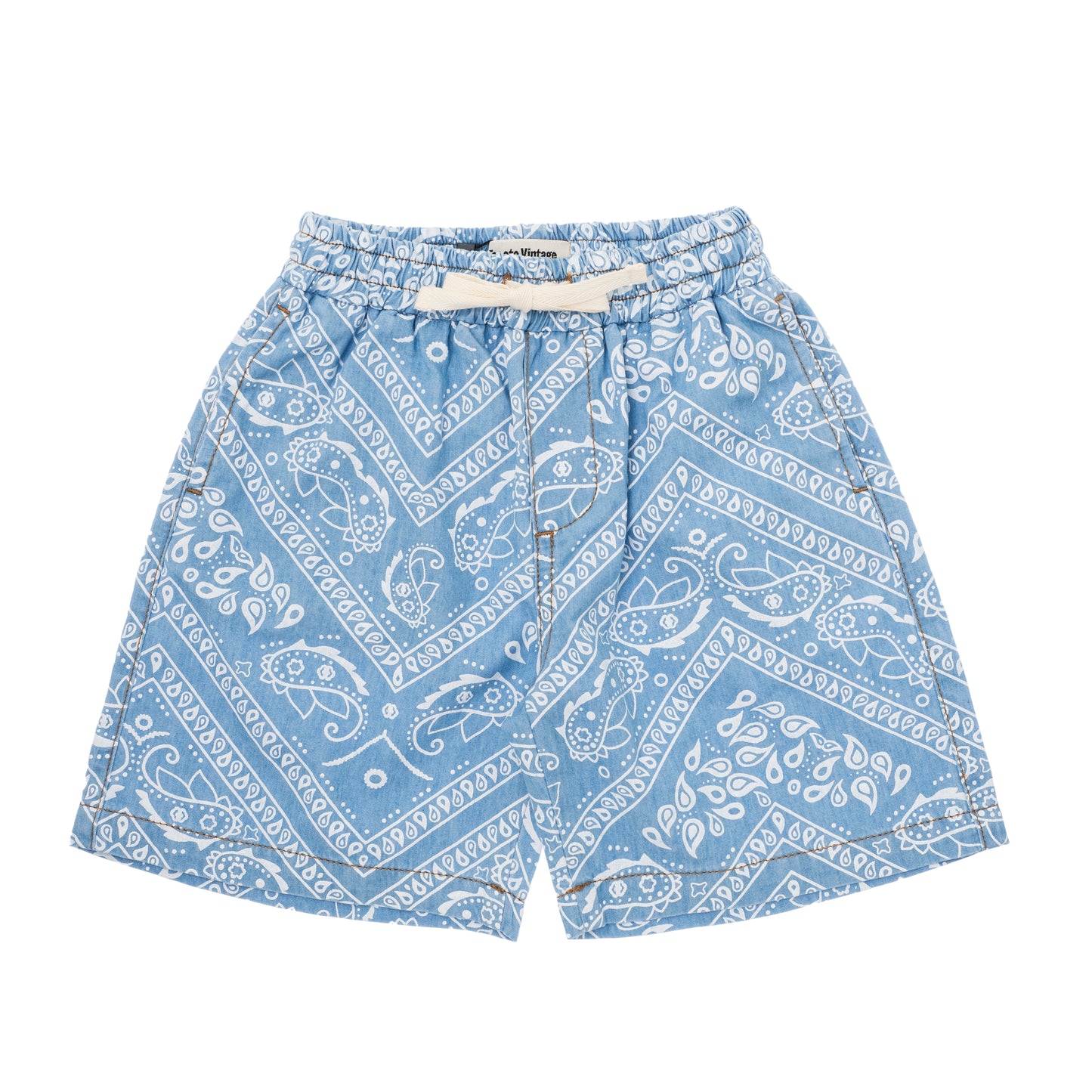 Cool denim Bermuda shorts made of supple cotton. The shorts have a relaxed fit, cool bandana print, side pockets, a pocket on the back and an elastic waistband with drawstring.