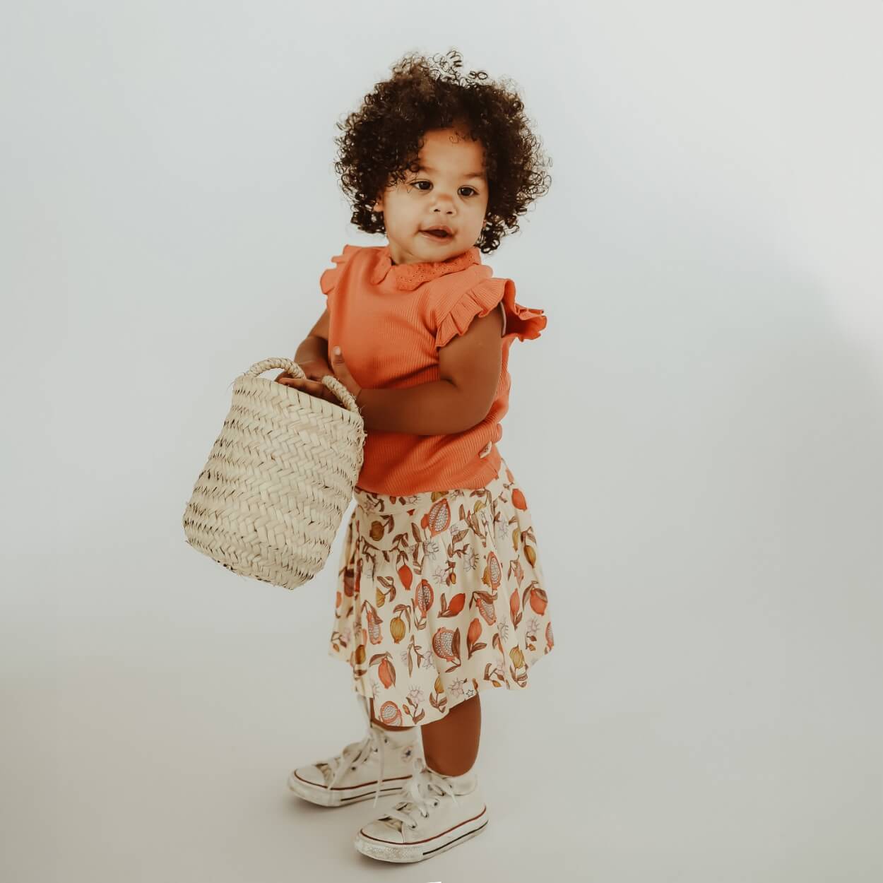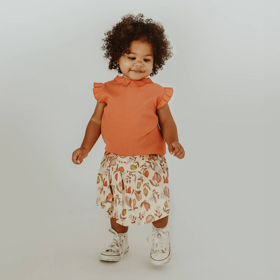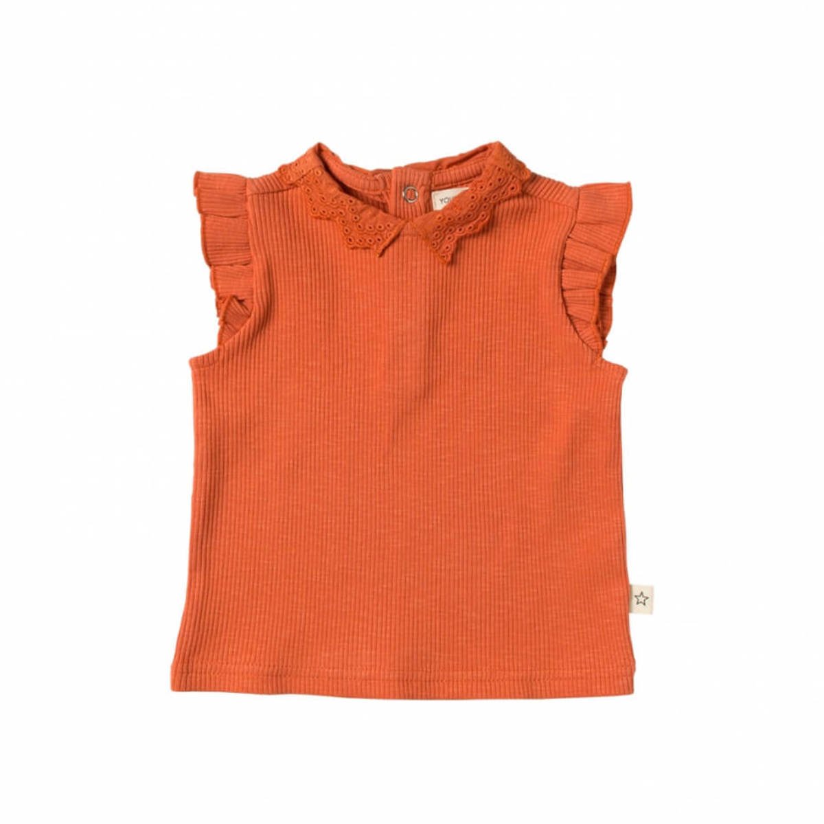 Mooi topje voor de meisjes van heerlijk zachte fijne rib kwaliteit. Perfect voor de warme zomerdagen. Dit oranje topje is een echte musthave voor je kleintje. Het topje heeft een nauwsluitende fit is mouwloos met ruffles op de schouders, drukknoopjes achterin de nek om aankleden makkelijker te maken en een klein klassiek crochet kraagje.