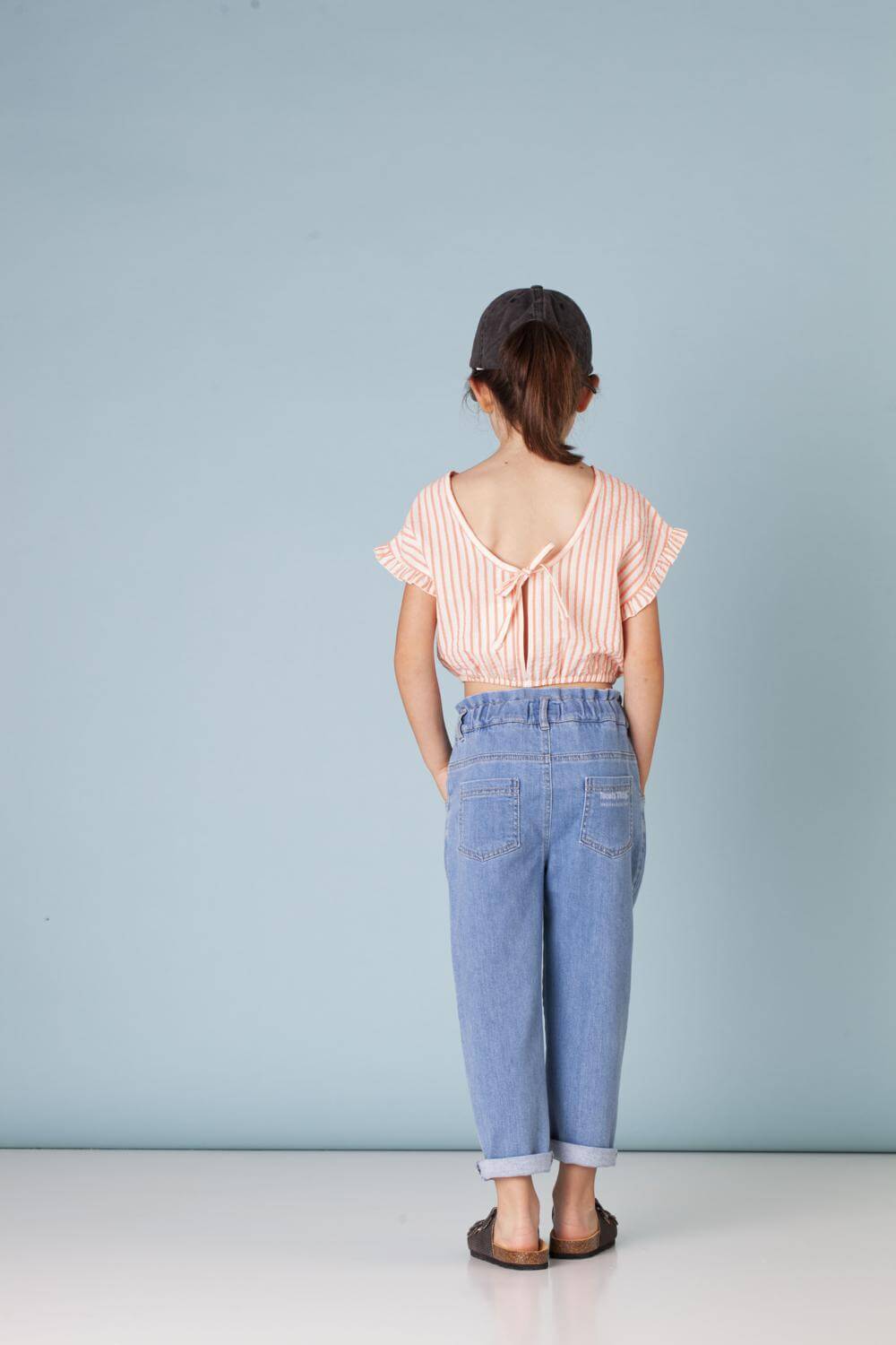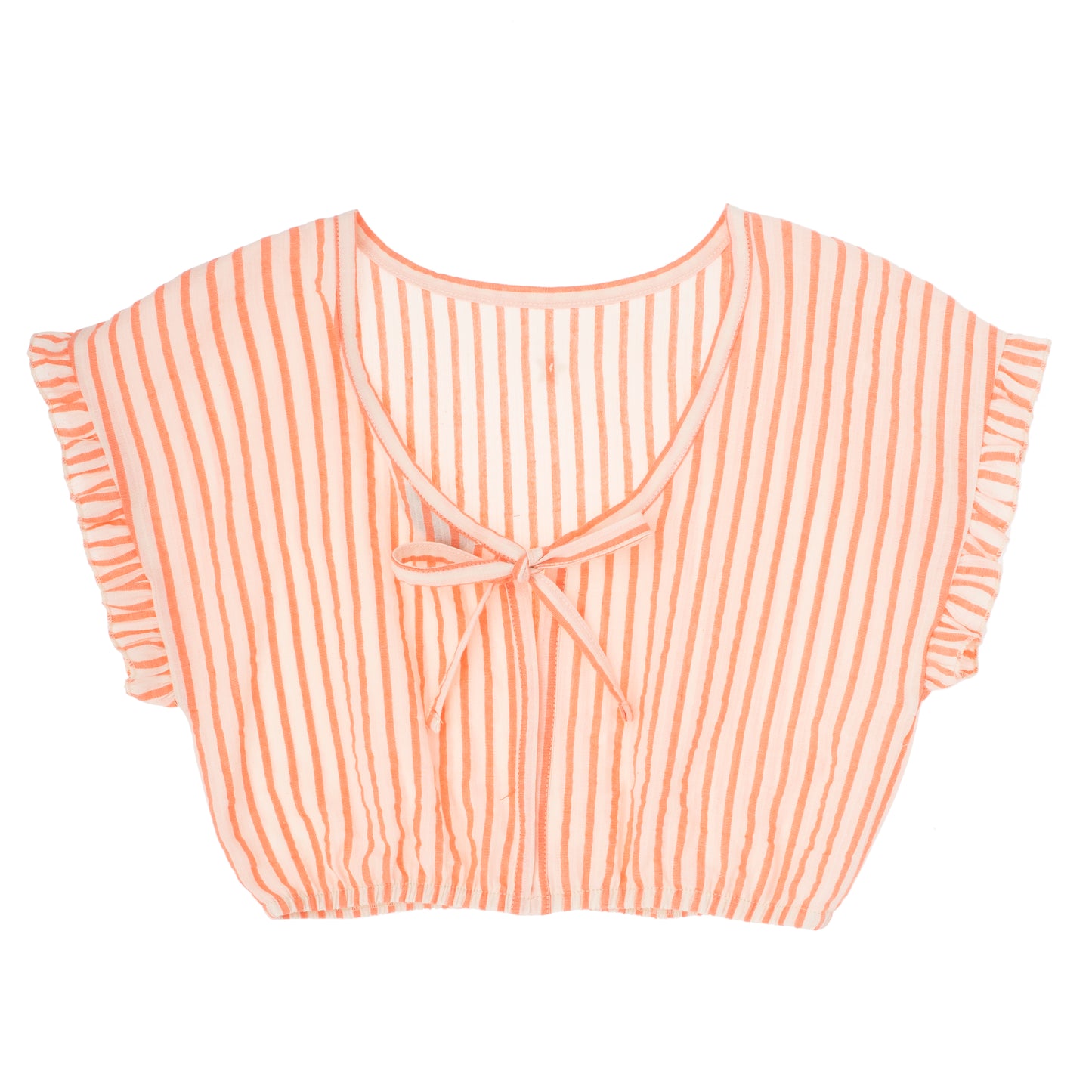 Beautiful blouse of soft and airy quality. The blouse is sleeveless with ruffles, has a pink and white striped print, a cropped model with elastic at the bottom and a half-open back with a bow.