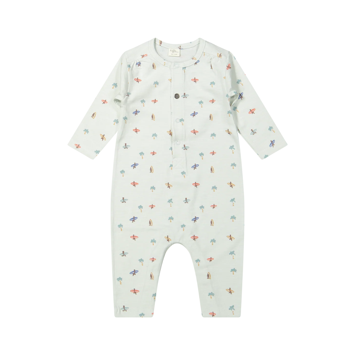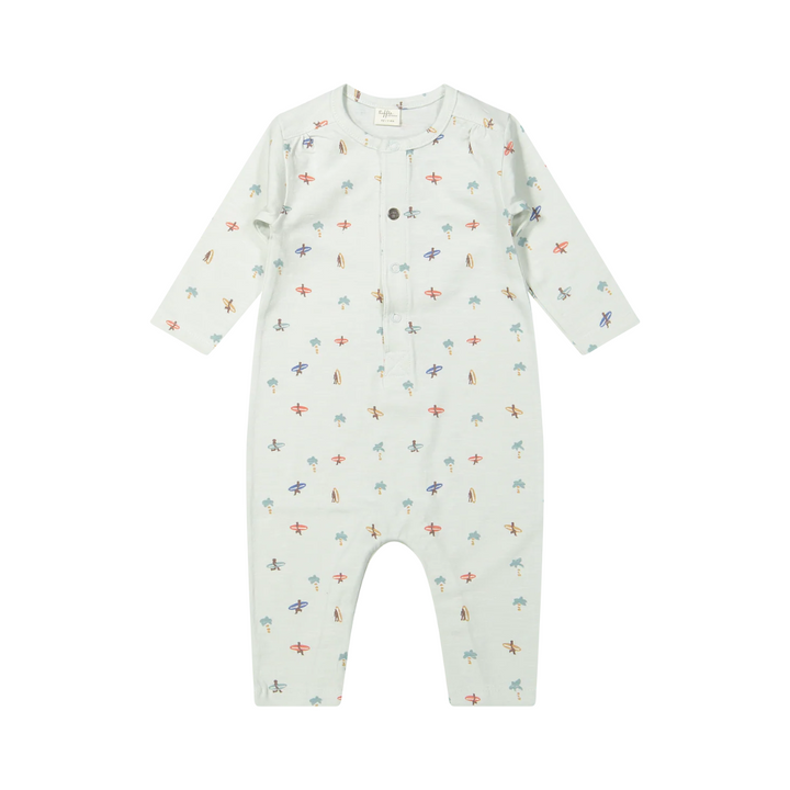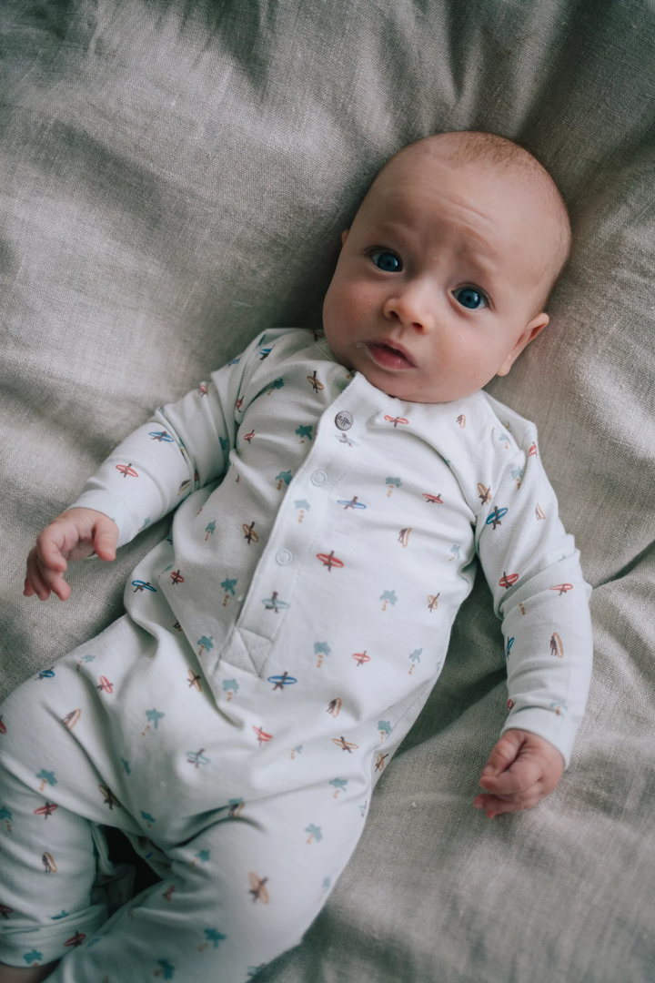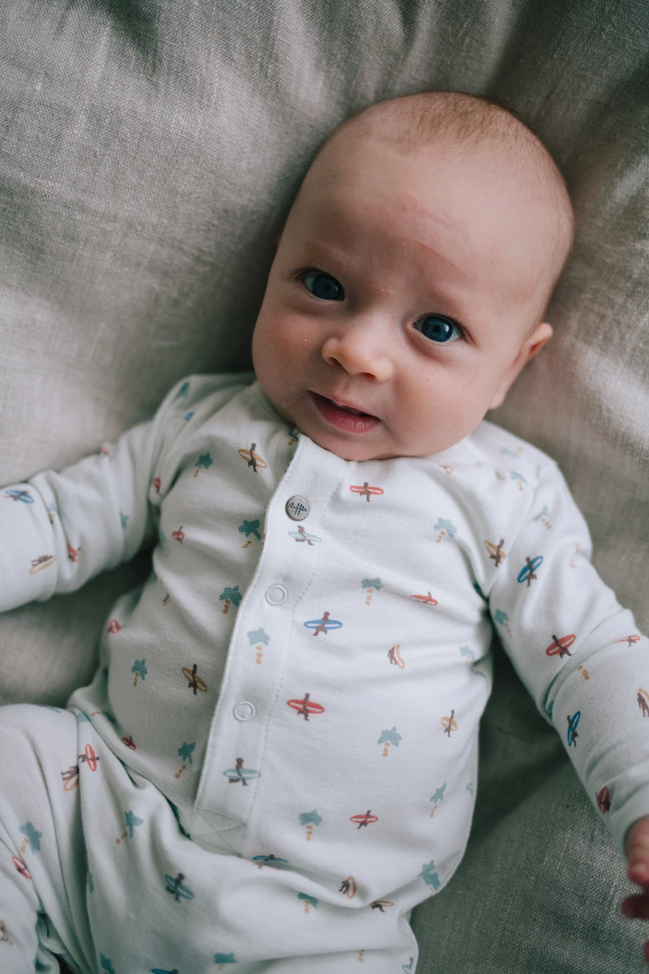 Dit stoere newborn pakje is een echte musthave voor uw pasgeboren jongen deze zomer! De mooie ecru kleurige basis met een all-over printje van palmboompjes en surfers brengt u al helemaal in de zomerse sferen. Gemaakt van 100% organisch slub jersey katoen is dit stofje super zacht voor de nog tere babyhuid. Het pakje heeft lange mouwen en een broekje met lange broekspijpjes en drukknoopjes in het kruis, voor het gemakkelijk verschonen van de luier. Verder heeft het knoopjes aan de voorzijde om het aan- en uitkleden gemakkelijk te maken. Ga voor een complete look en combineer dit mooie pakje met de Hat Bowie Beach.