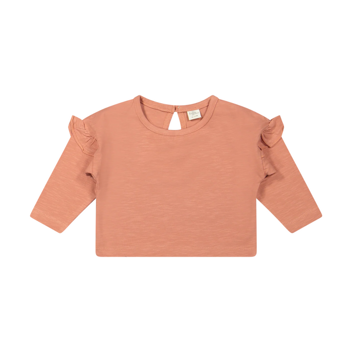Fijne sweater shirt van 100% biologisch katoen. Het shirt heeft een wat dunnere stof wat heerlijk is voor het wisselende weer in Nederland. Warm genoeg weer voor zonder een jas maar wellicht nog net iets te fris voor een korte mouw. De sweater heeft een lange mouw met ruffle op de schouder wat het een schattige uitstraling geeft. De effen koraal roze kleur laat het mooi aansluiten op de overige item uit de Beach Hangout collectie van Riffle Amsterdam. Het knoopje achterin de nek maken het aan- en uitkleden gemakkelijker.