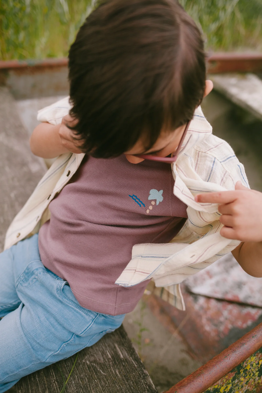 Mooie basic unisex shirtje van Riffle Amsterdam. Het shirtje is gemaakt van 100% biologisch katoen in rib kwaliteit, een wat steviger materiaal die voor een optimale pasvorm zorgt. De korte mouwen maken het zeer geschikt voor warme zomerdagen, terwijl de kleur en de pasvorm ervoor zorgen dat dit shirtje leuk bij zowel een meisje als een jongen staat. De mooie paarse kleur en het geborduurde palmboompje met golven laten het perfect goed matchen met de overige items uit de Beach Hangout Collectie van Riffle Amsterdam. Match hem bijvoorbeeld met de Short Zed Sunshine voor een meisje en met de Short Suri Sweat Surf voor een jongen.
