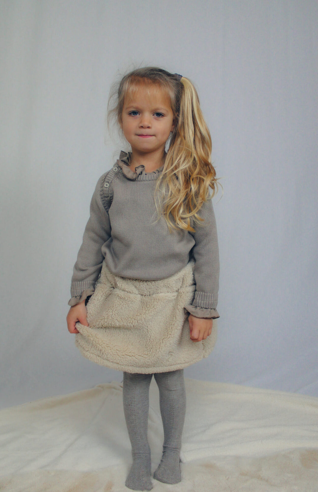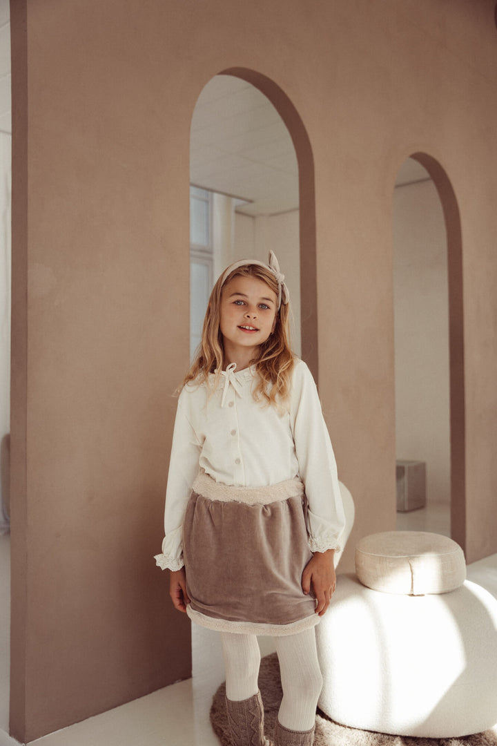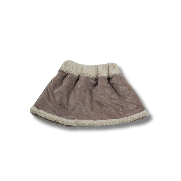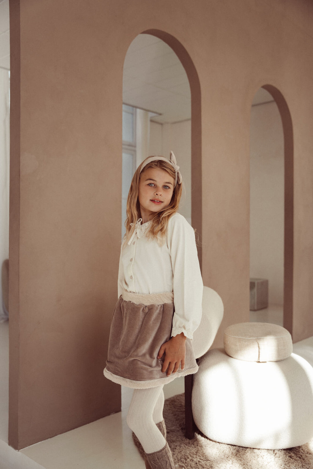 Deze twee in één rok is de musthave van dit najaar. De rok is gemaakt van een polyester/elastine mix en is reversible en kan dus beide kanten gedragen worden. De ene kant is van heerlijke zachte creme kleurige Teddy en de andere kant is van taupe kleurige velvet rib, fijne corduroy kwaliteit. Naast dat deze rok supermooi is en door de kleur gemakkelijk met van alles te combineren is, zal deze rok uw kleine meid ook heerlijk warm houden dit najaar