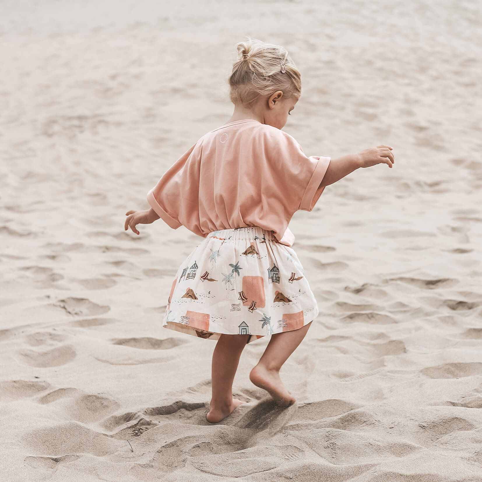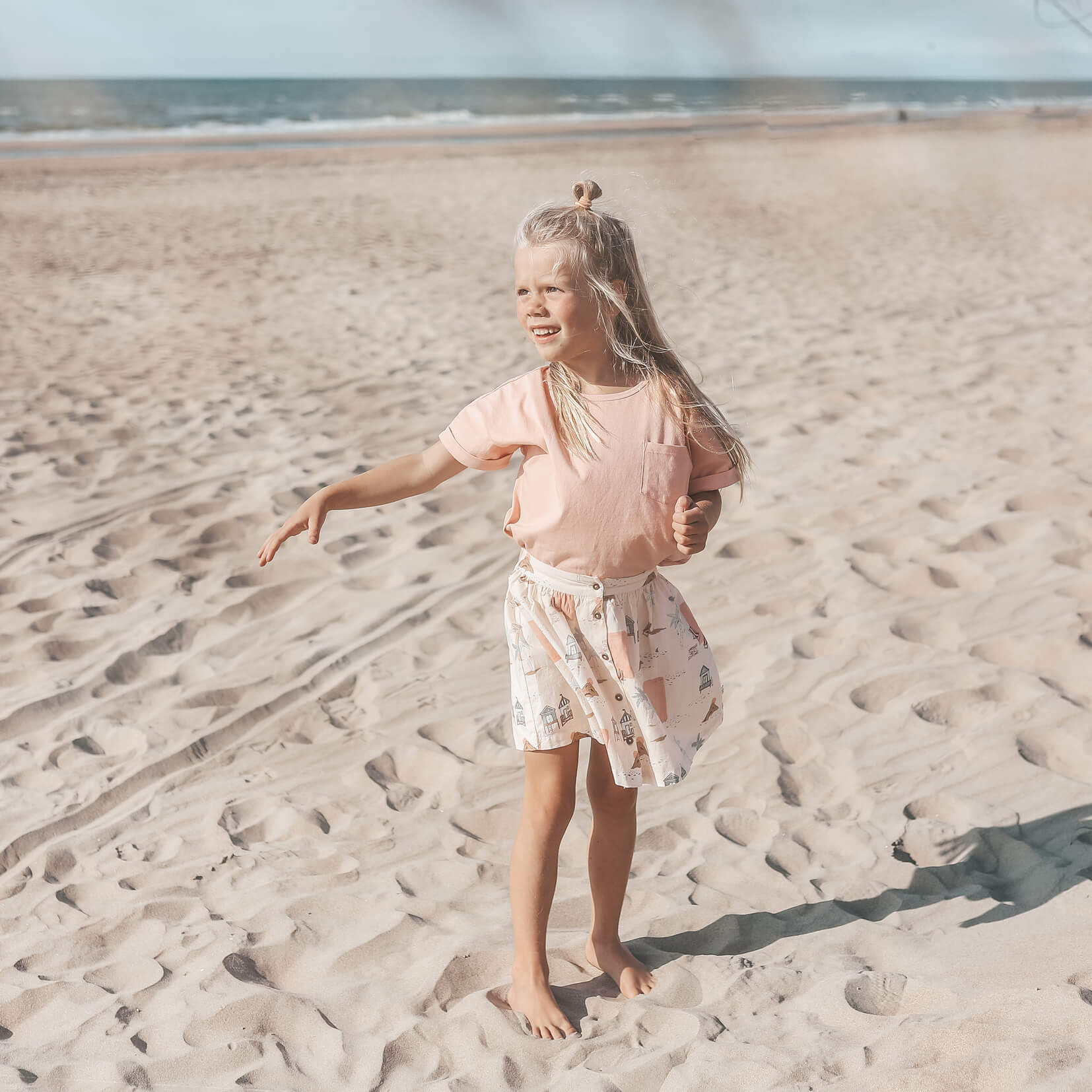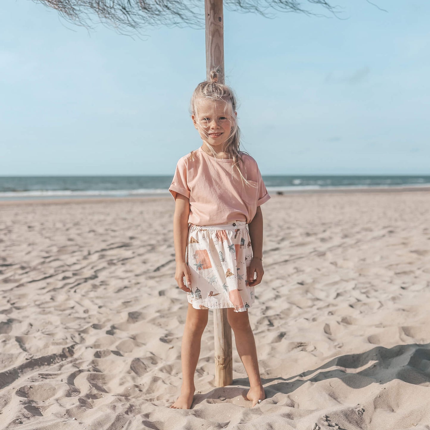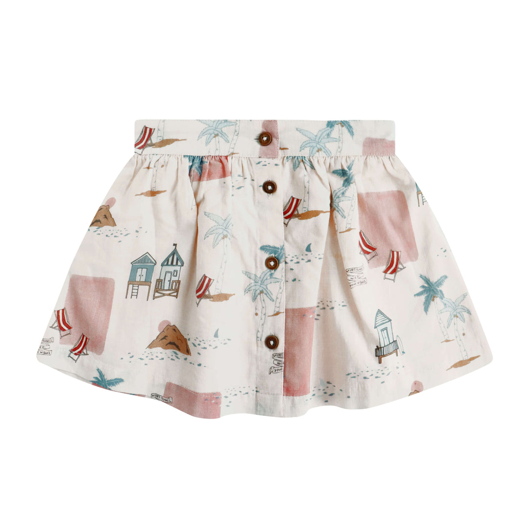 Rokje van luchtige kwaliteit, met elastische band om de heupen, knoopjes aan de voorzijde en een zomers strand printje.