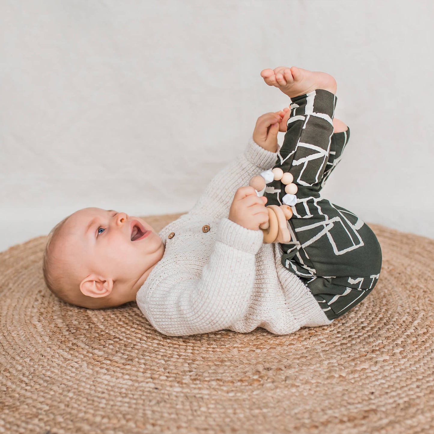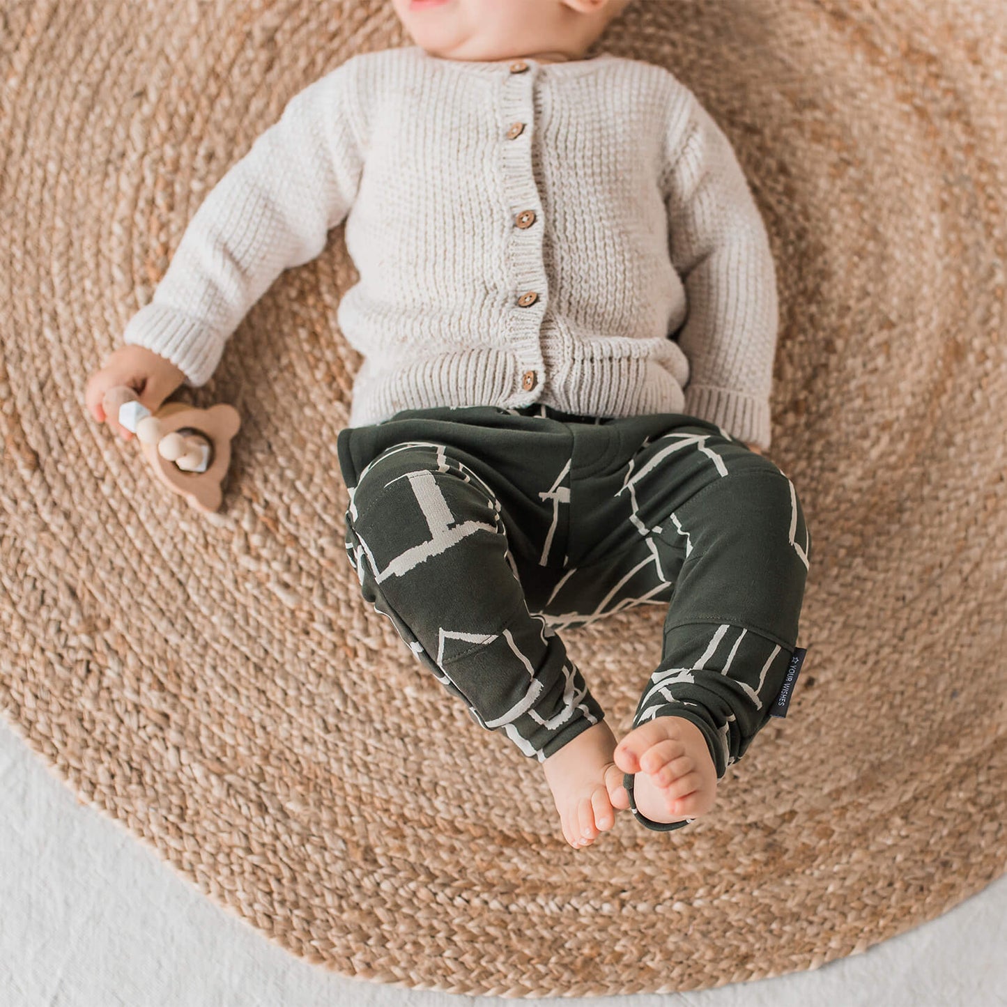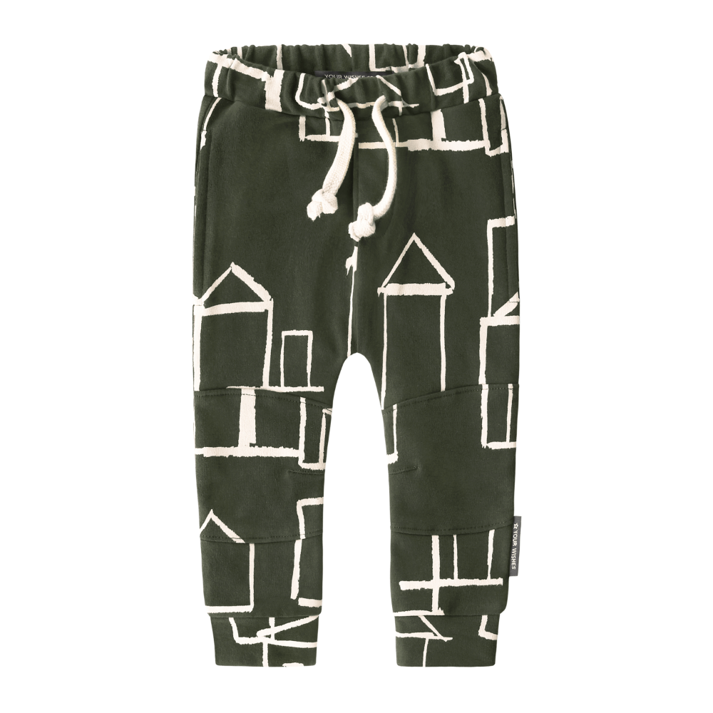 Jogging broekje met Crayon getekende huisjes-print en knoop koord aan de voorkant.