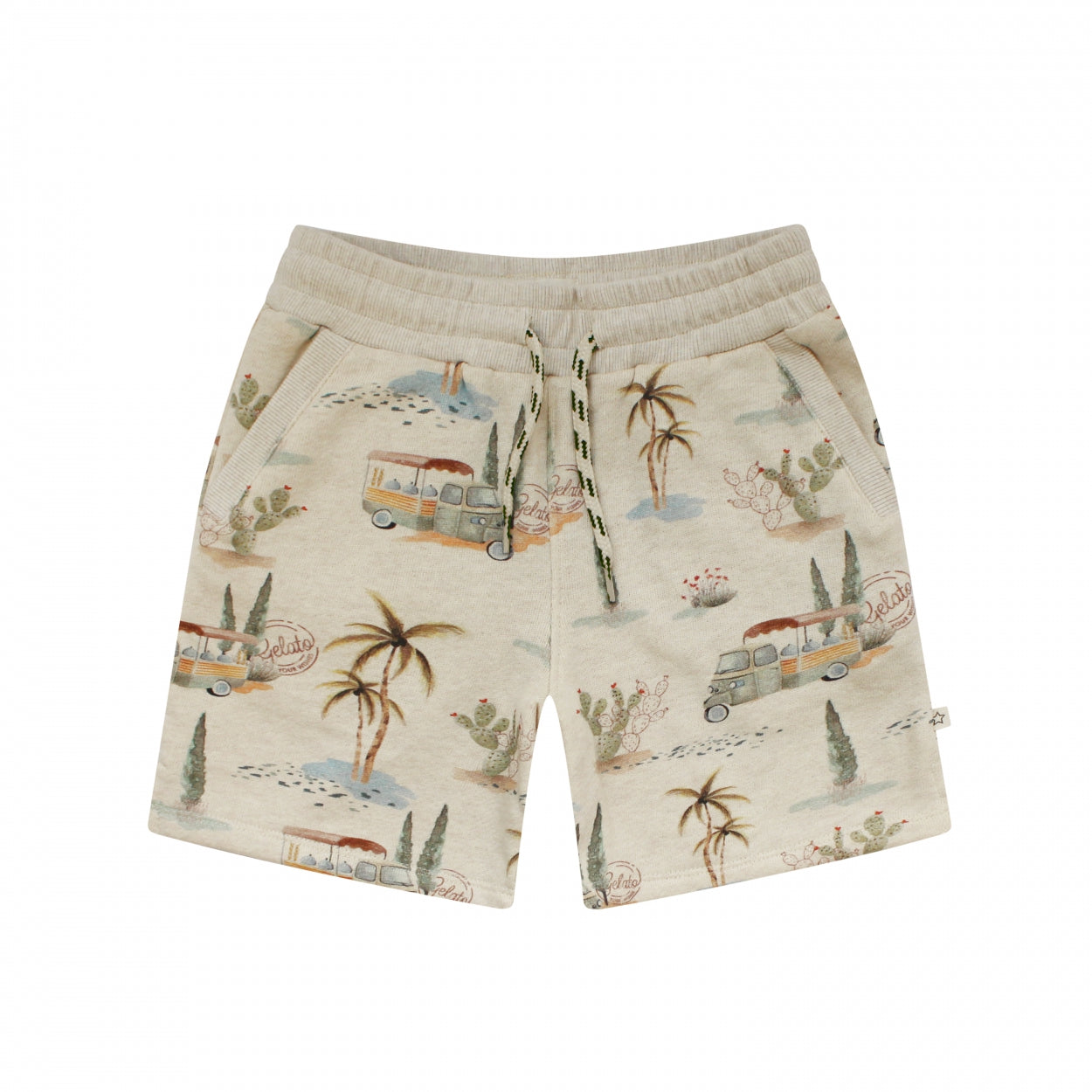 Stoere korte jongens broek van zacht katoen. De broek heeft een ruime fit, steekzakken en een stoere all-over print van ijskarren en palmbomen.