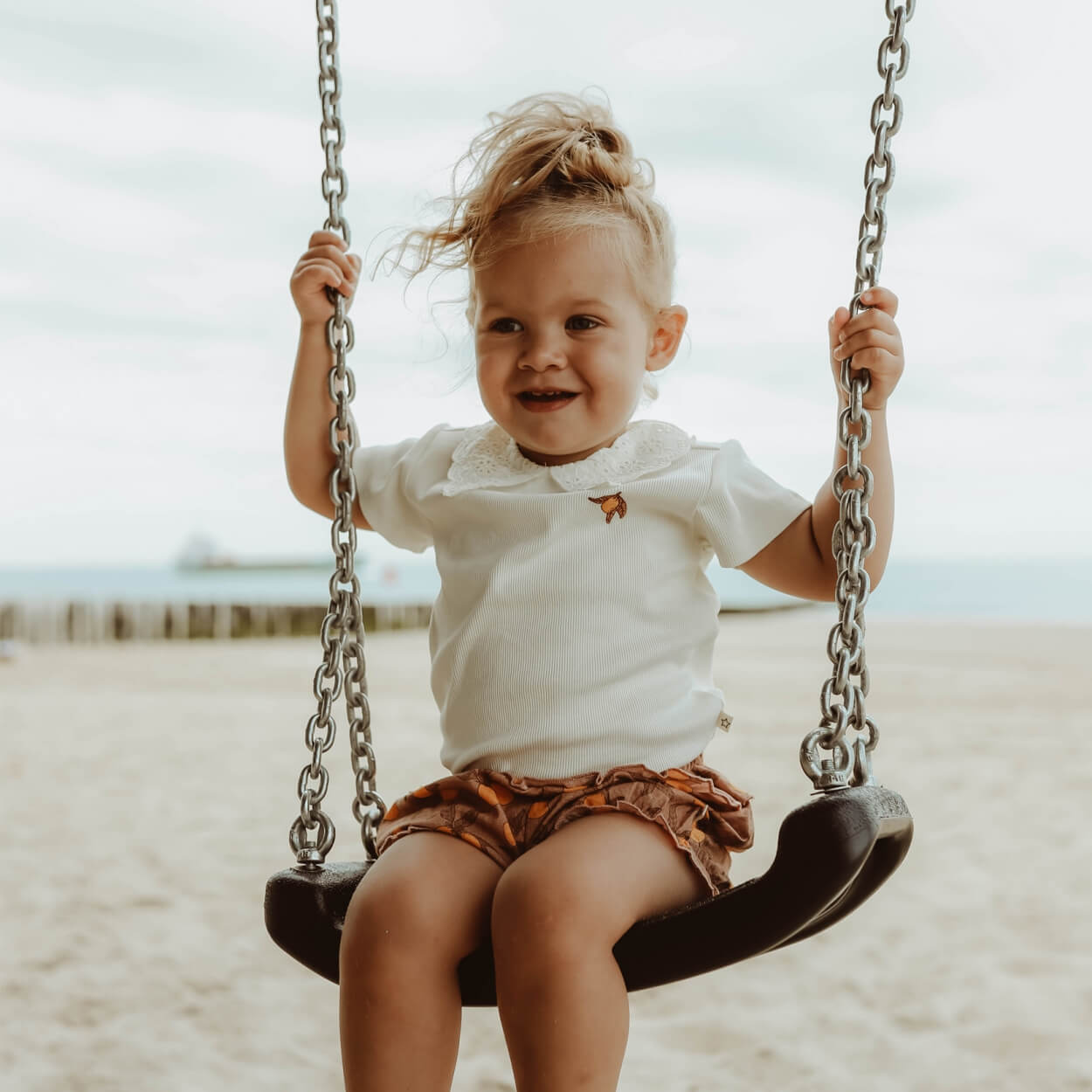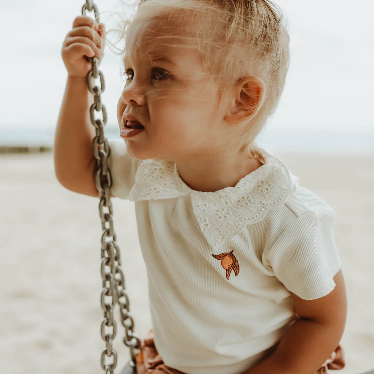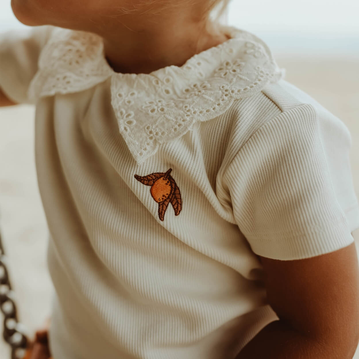 Schattig baby shirtje van fijne rib kwaliteit. Dit ecru kleurige shirtje van heerlijk zacht katoen is een echte musthave voor je kleintje. Het shirtje heeft een nauwsluitende fit, korte mouwen, geborduurde opdruk op de borst en een superlief crochet kraagje met drukknoopjes op de rug.
