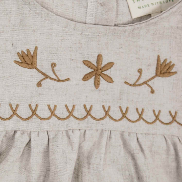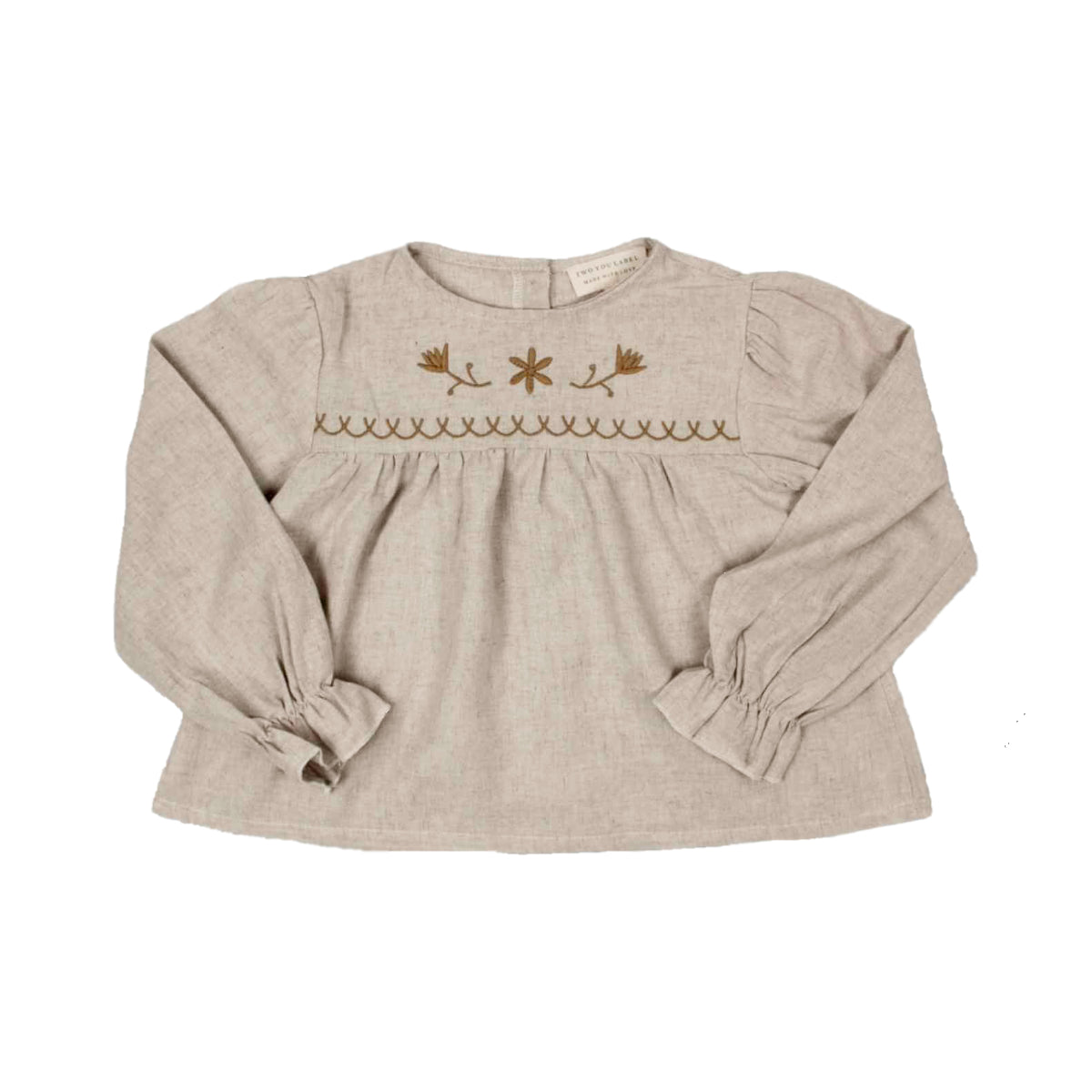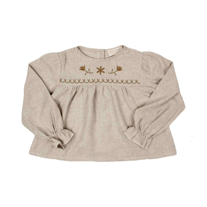 Deze mooie blouse voor meisjes is een ware aanwinst voor de garderobe van uw kleine meid. De blouse is verkrijgbaar in de maten 86/92 t/m 134/140 en is gemaakt van 65% en 35% linnen. Deze stof maakt de blouse erg soepel en luchtig waardoor deze erg comfortabel aanvoelt, vooral tijdens warme dagen. De blouse heeft een babydoll model wat het een wat wijdere fit geeft. De plooien op de schouders en het elastiek aan de uiteinde van de lange mouwen geven deze mooie blouse pofmouwen voor een chique uitstraling. De mooie lichtbeige kleur met honingkleurige geborduurde details aan de voorzijde laten deze blouse perfect matchen met de overige items uit deze prachtige zomercollectie. Stijl hem bijvoorbeeld met de Sally Skirt Honeybee of de Lilly Legging Straight Embroidered Honeybee.