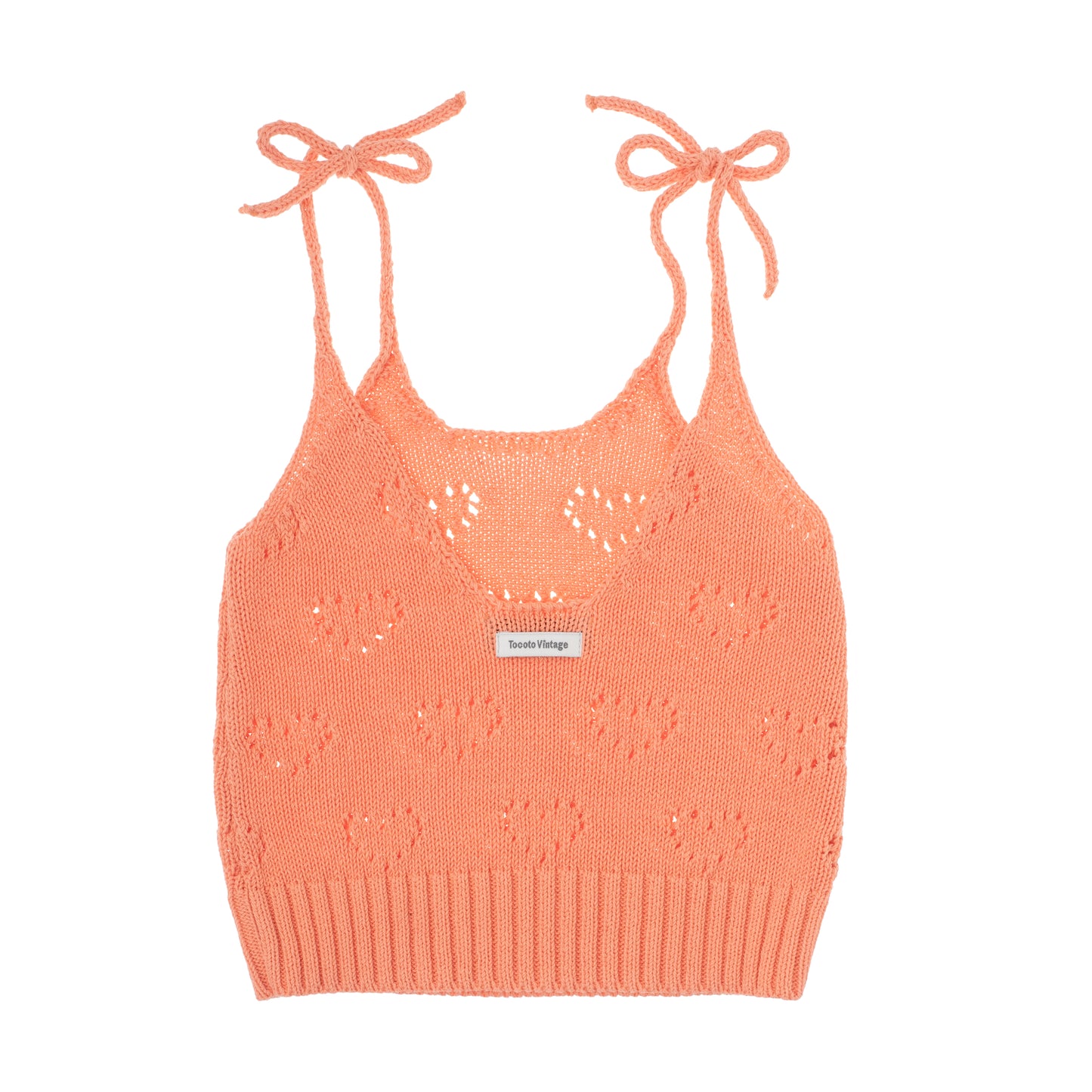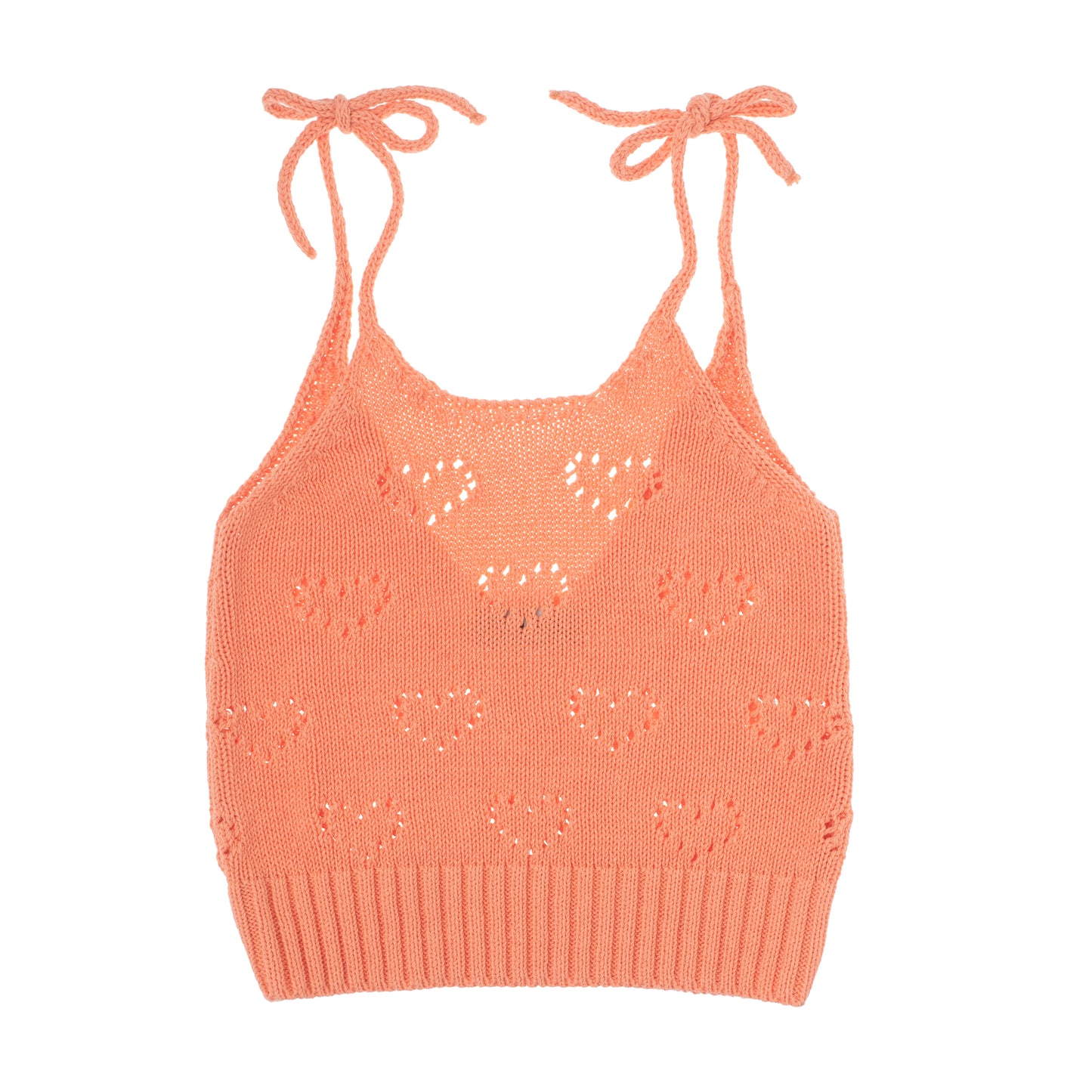 Mooie gebreide top van 100% katoen. De top is mouwloos met geknoopte spaghetti bandjes, heeft een mooie zalm kleur, hartjes patroon en lage rug.