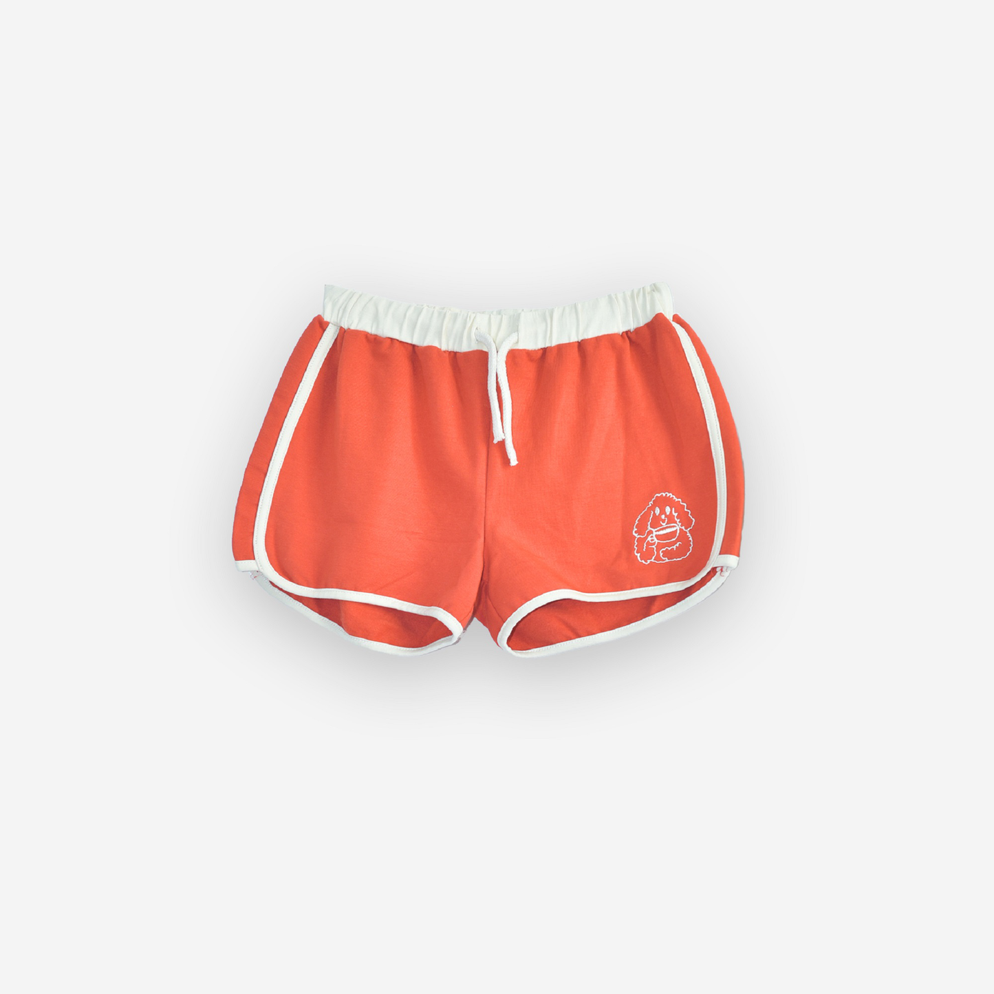 Stoere korte broek van zacht katoen. De short is rood van kleur met witte randen en wit geborduurde opdruk op een van de broekspijpen. De short heeft een elastische band met sluitkoord.