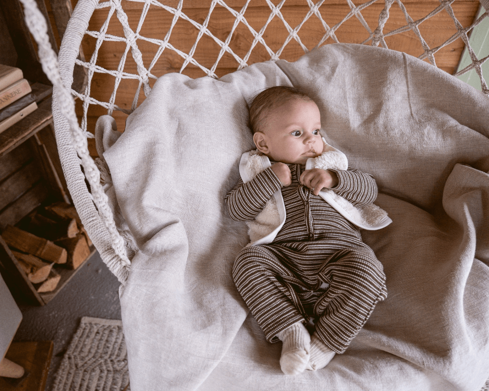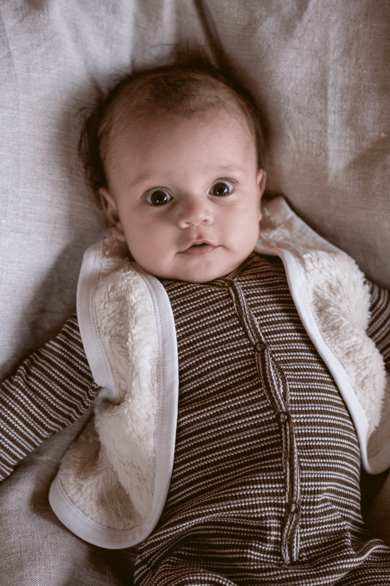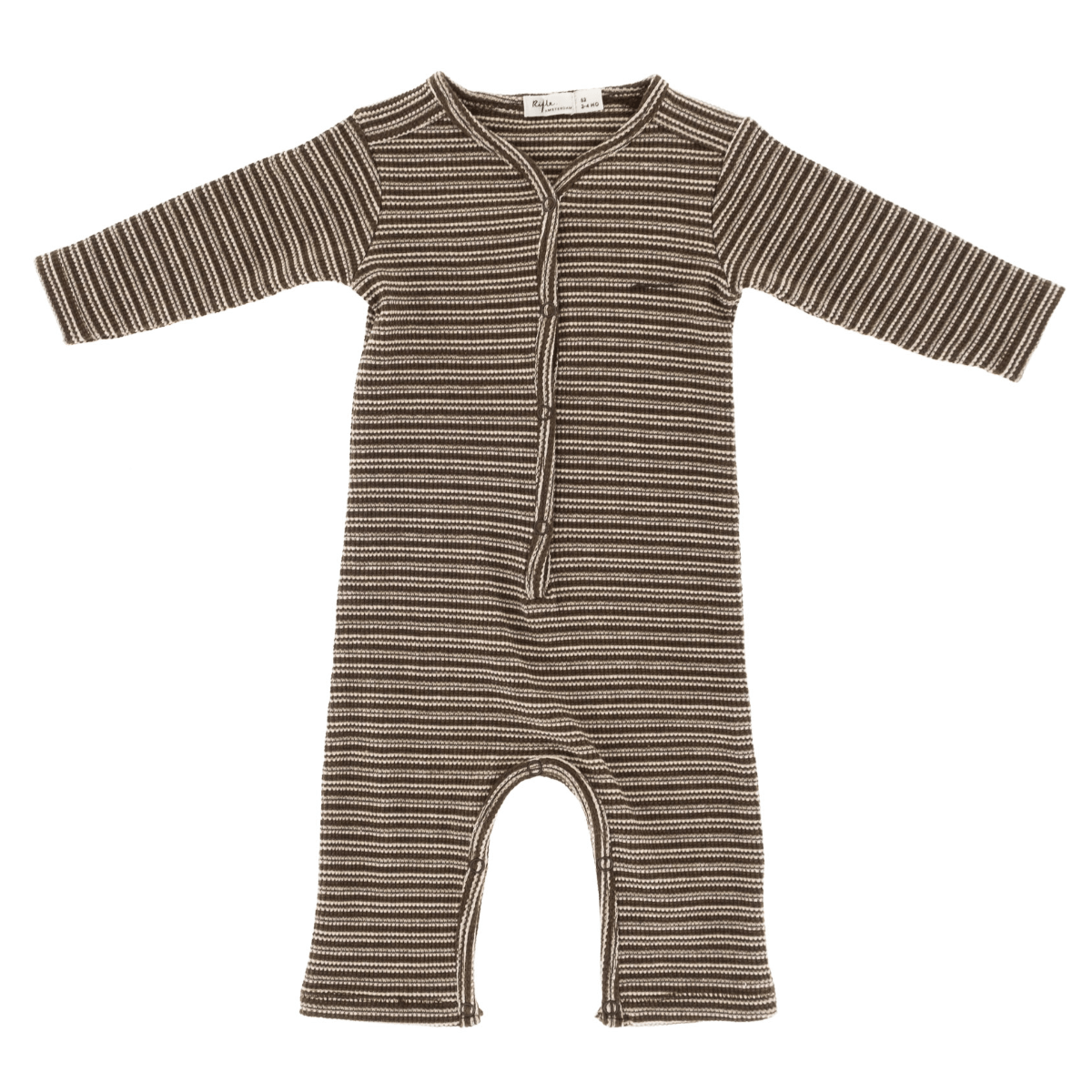Boxpakje van dikke geribbelde stof met een mooie klassieke streepjes print. Het pakje heeft drukknoopjes aan de voor en onderkant om het aankleden en verschonen makkelijker te maken. De dikke stof en mooie kleur zorgt ervoor dat dit pakje perfect is voor de herfst en de winter.