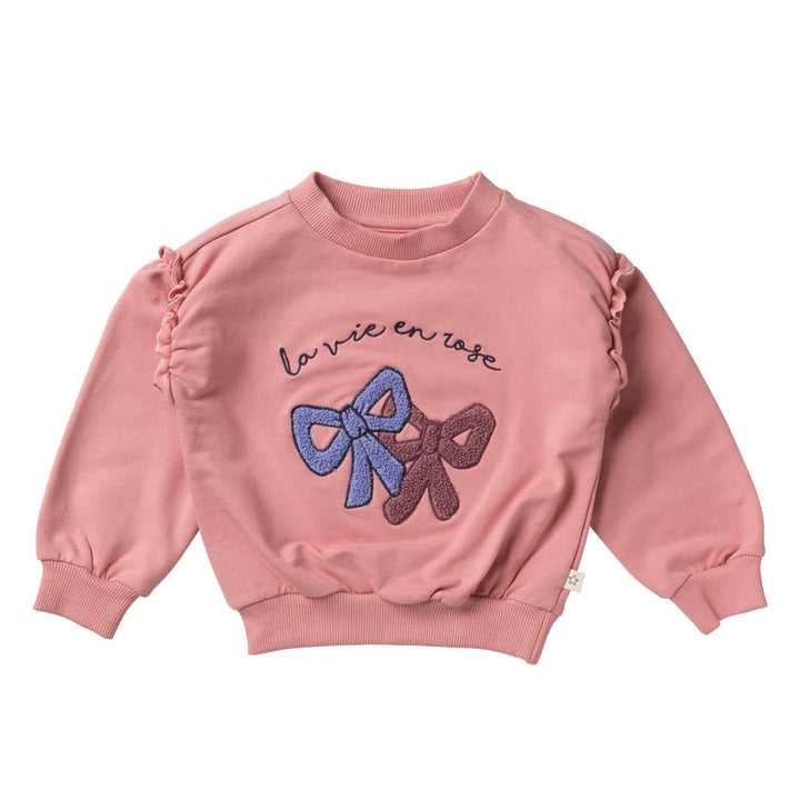 La Vie en rose met deze schattige roze trui van Your Wishes! Deze meisjestrui uit de Sugar Rush collectie is het perfecte item voor een trendy en comfortabele look. De trui heeft een zachte teddy opdruk van twee pastel kleurige strikjes en is gemaakt van een hoogwaardige French knit-mix. Daarme biedt dit kledingstuk optimaal comfort, ideaal voor de wat frissere lente- en zomerdagen. Kleine ruffles op de schouders geven de mouwen een subtiel en schattig detail. Voeg een zoete, stijlvolle touch toe aan de garderobe van je kind en combineer deze prachtige trui met de Slub Denim Short om de look compleet te maken.