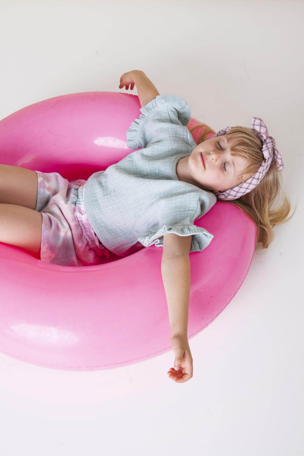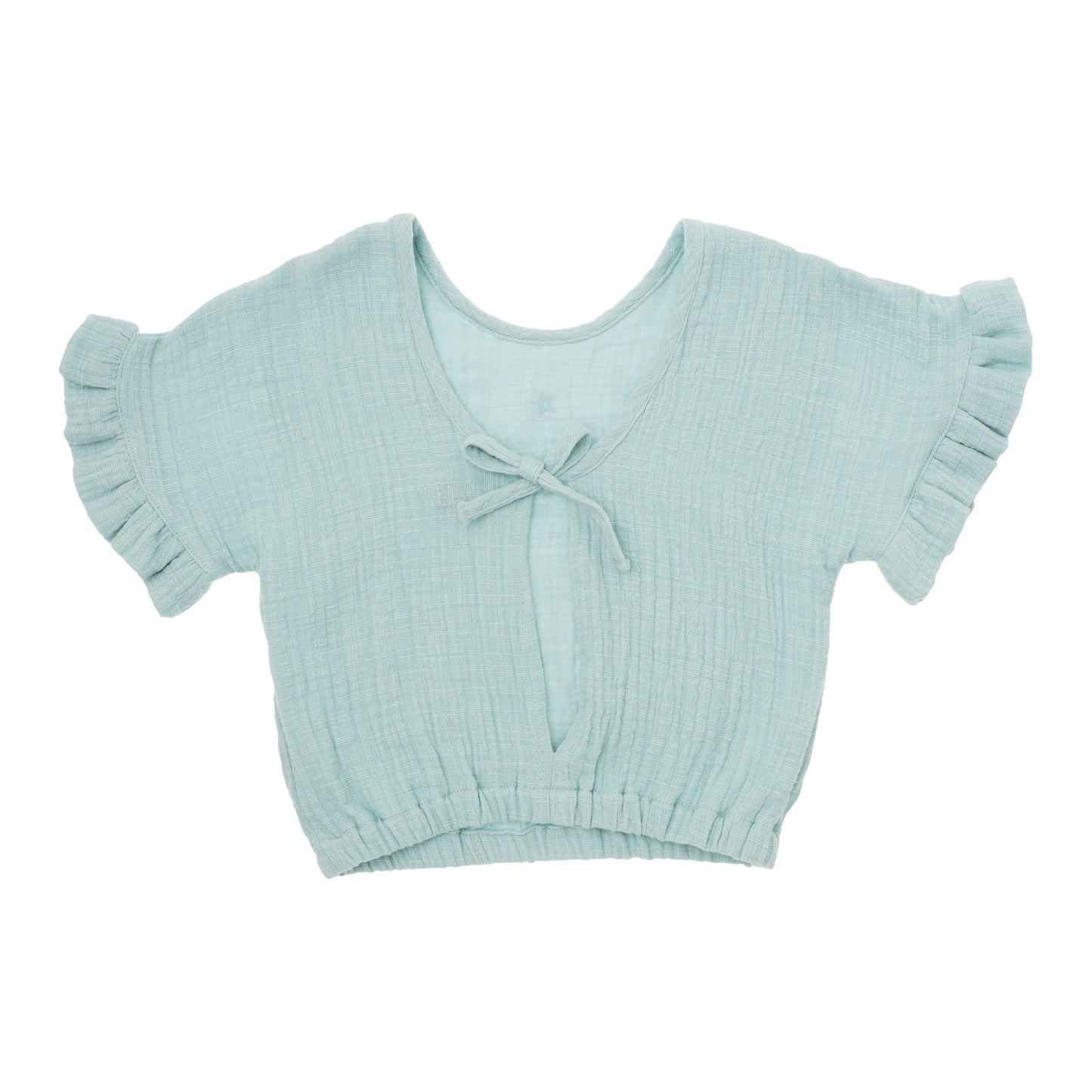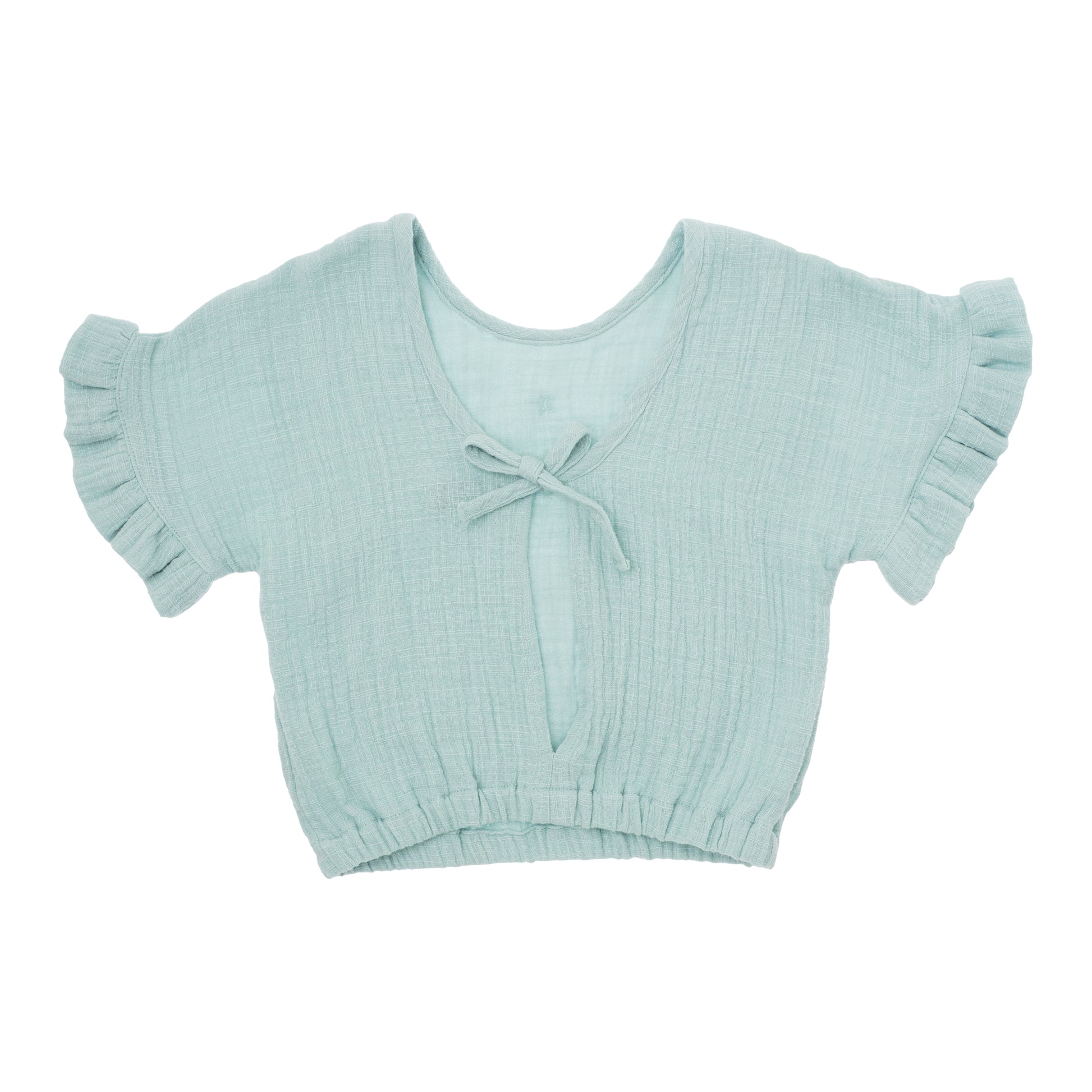 Mooie meisjes blouse van heerlijk luchtige kwaliteit. het blousje heeft korte ruffle mouwen een mooie mintgroene kleur en een open half open rug met strikje.