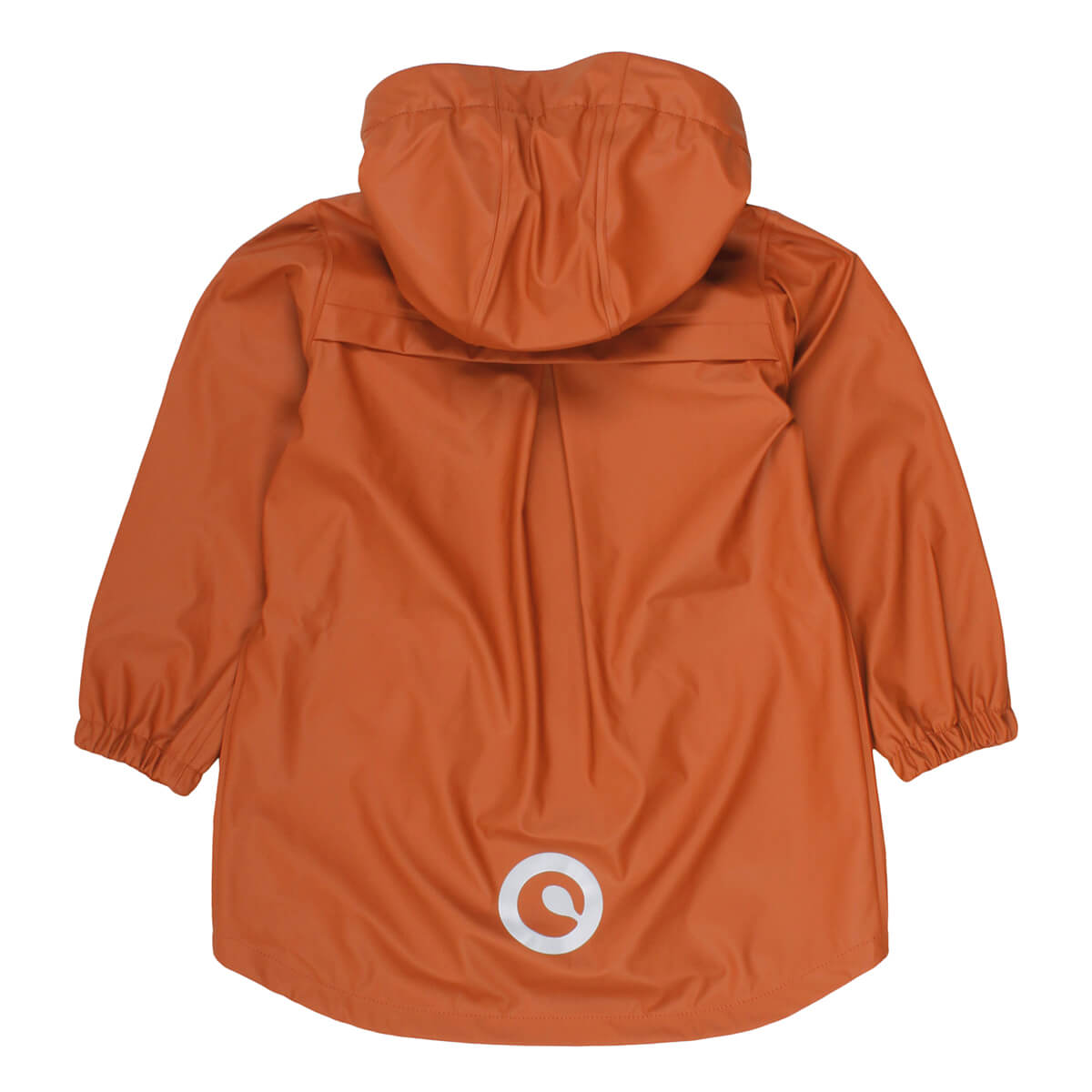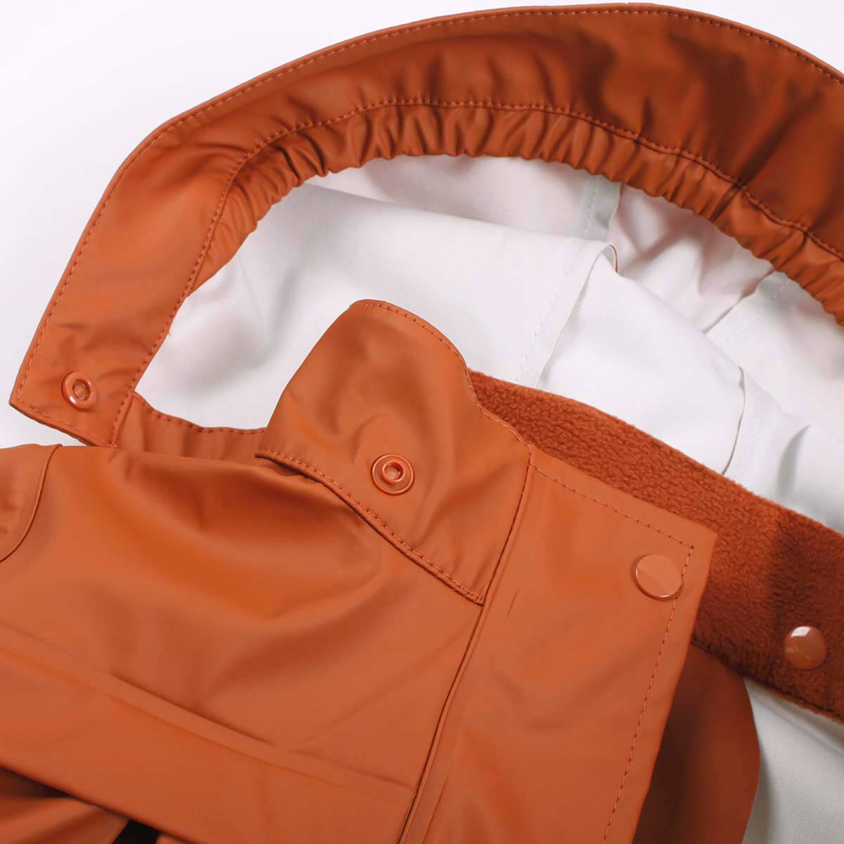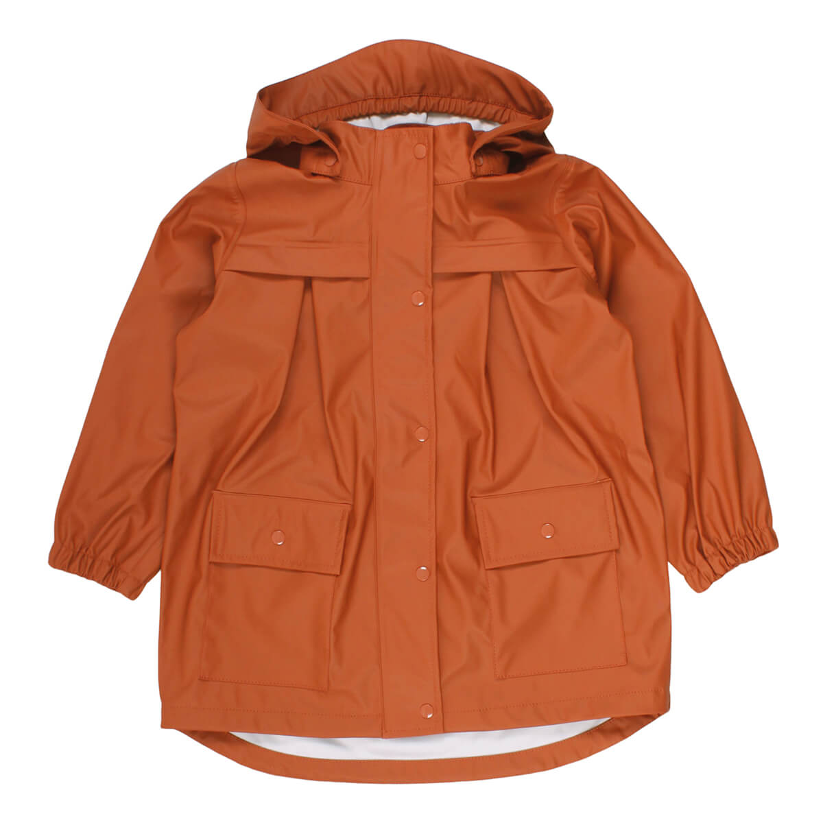 Lange regenjas van waterafstotende kwaliteit. Met afneembare capuchon, rits en drukknopen.