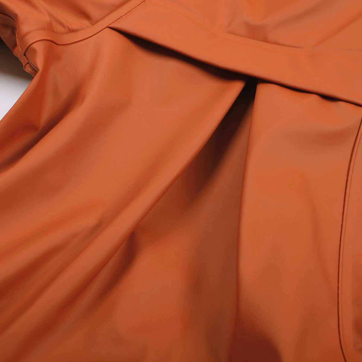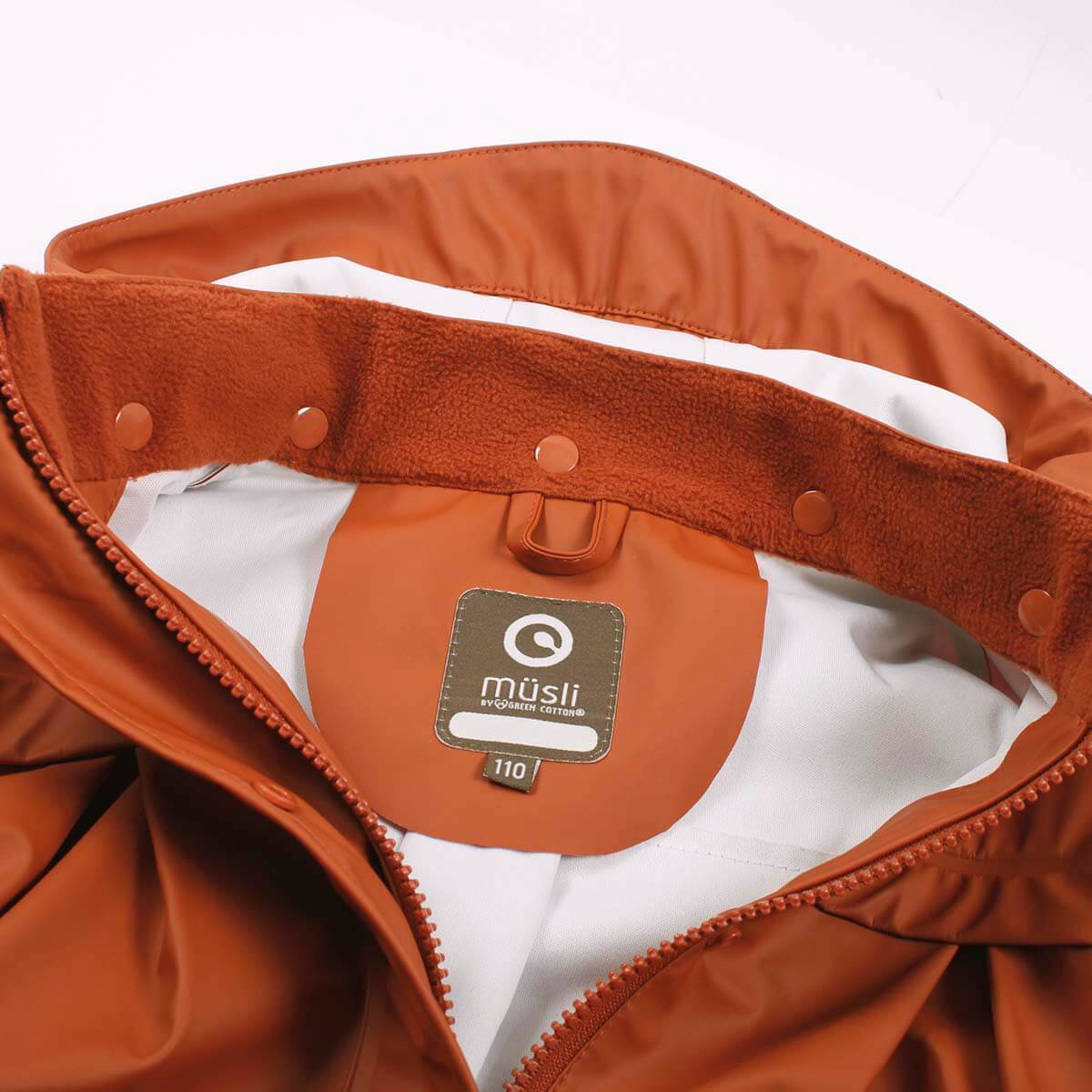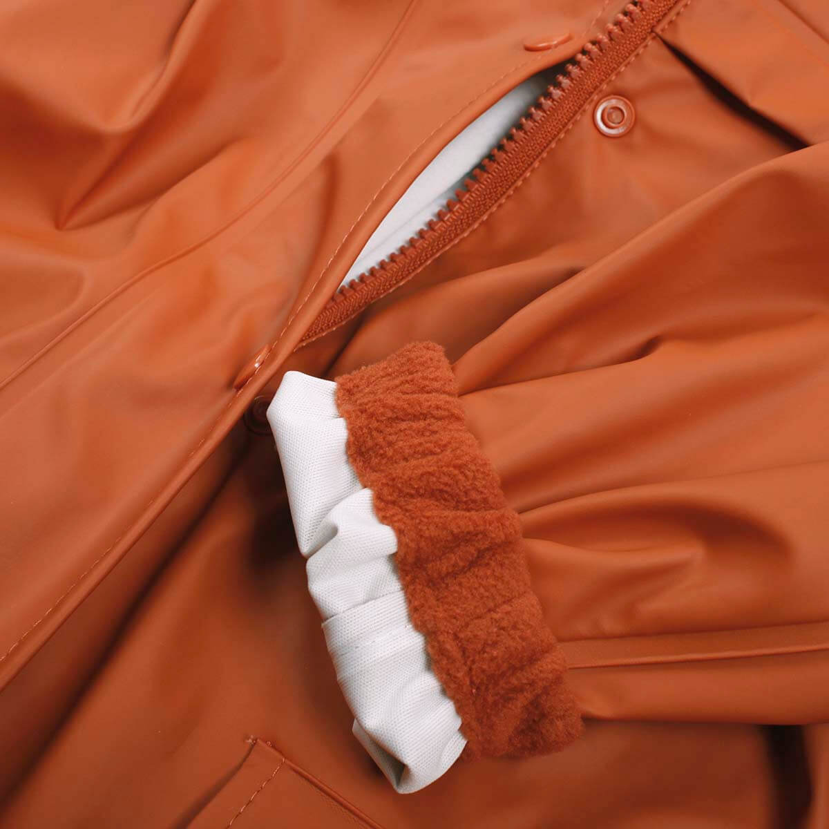 Lange regenjas van waterafstotende kwaliteit. Met afneembare capuchon, rits en drukknopen.