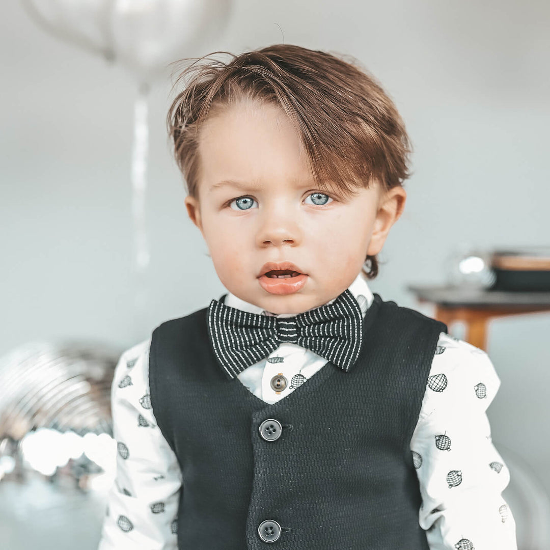 Suit up met deze opvallende vlinderstrik van Your Wishes. Deze strik is verkrijgbaar in één maat en daardoor voor elk kindje een match! De strik is verstelbaar, want je kunt de elastieken band verstellen door middel van een klein gespje en makkelijk om de nek doen dankzij de klittenbandsluiting. De strik is uitgevoerd in een zachte zwarte stof met een subtiele glitterstreep om uw kindje te laten shinen! Met de Sparkle Rib Bow Tie in combinatie met de Disco Ball Relaxed Shirt, Stagger Boxy Gilet en Stagger Straight Pantalon maakt u een complete outfit die geschikt is voor elk feestje!