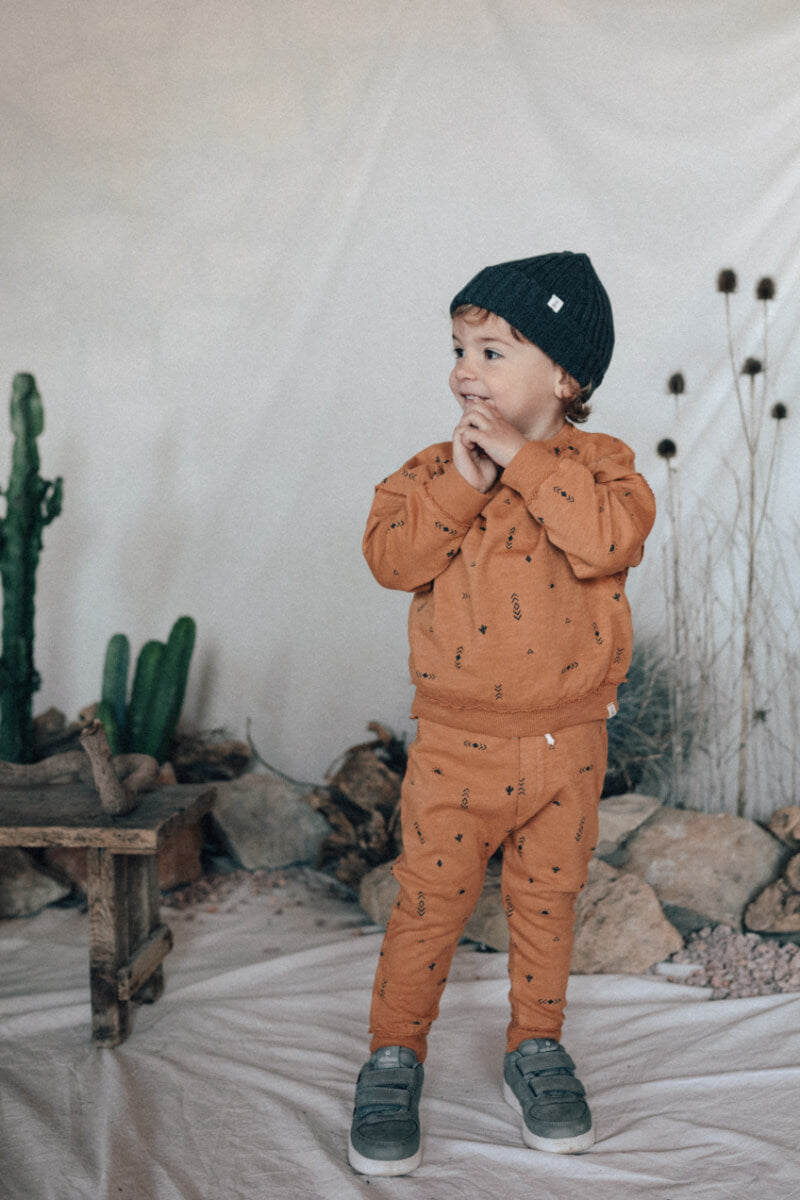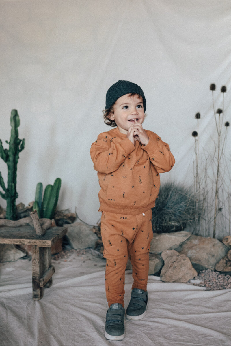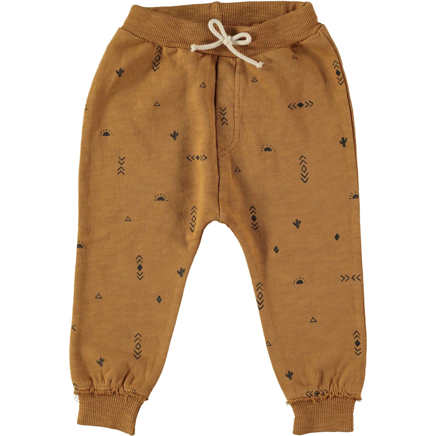 Joggingbroekje van heerlijk zacht katoen. Het broekje heeft een elastische tailleband, elastische banden aan de onderkant van de broekspijpen een decoratieve strik en mooie subtiele all-over print van pijltjes, zonnetjes en cactussen.